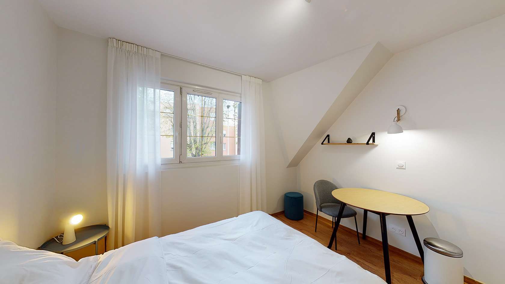 Le Studio 6, situé au premier étage, est un cocon parfait pour une personne. Avec ses 18m2, il dispose d'une salle de bain privée avec douche, d'un coin grignotage équipé d'un micro-ondes, d'une bouilloire et d'un frigo. Le lit double avec rangement, la penderie, la table et la chaise offrent tout le confort nécessaire pour étudier ou travailler dans un espace bien à vous.