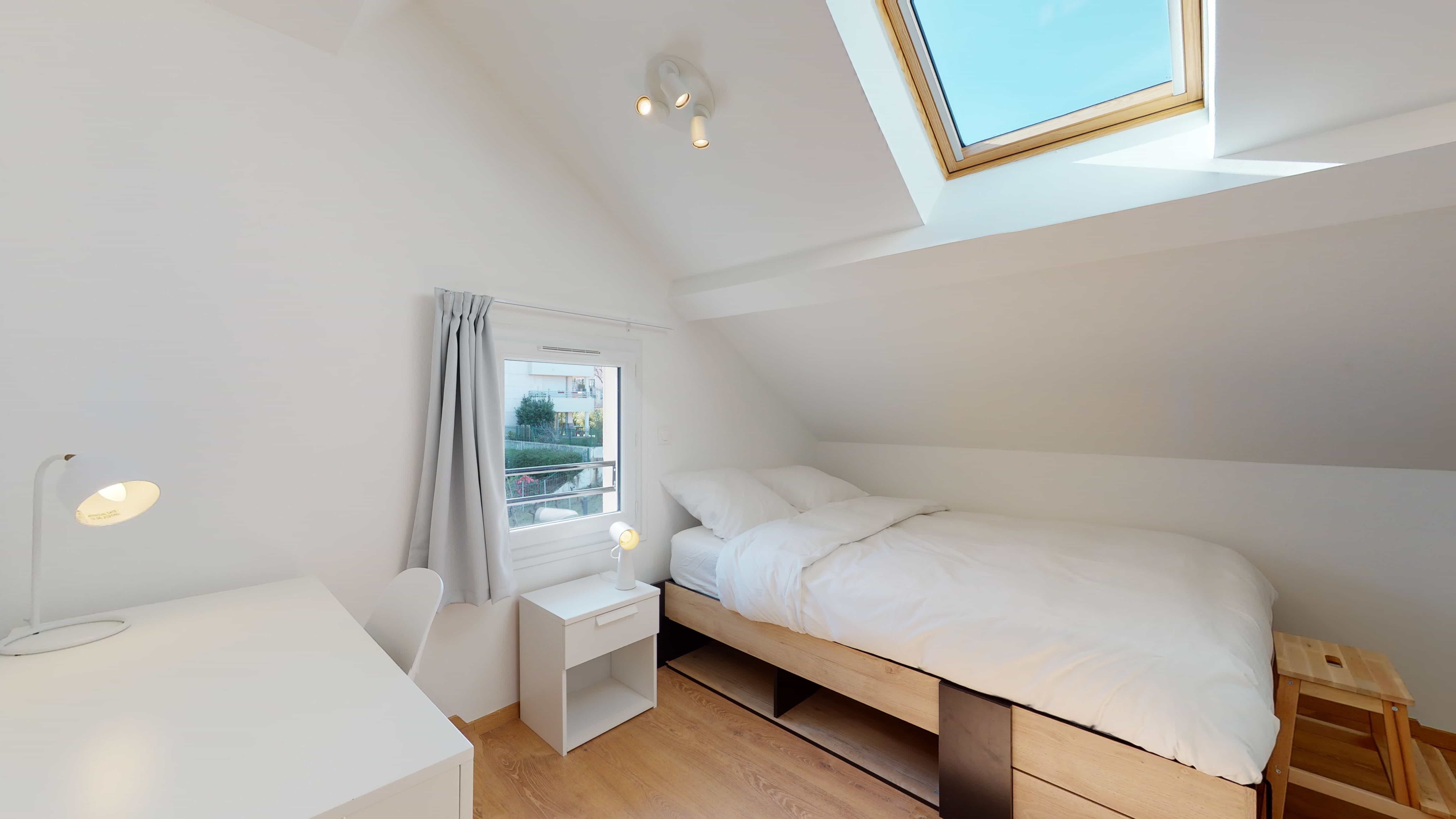 Votre future chambre, la "Room for one person - 11", est un cocon douillet de 9m² situé au deuxième étage. Elle est meublée d'un lit double avec literie de qualité, d'une armoire pour vos affaires, d'une chaise confortable et d'un bureau pour travailler ou étudier. La chambre bénéficie d'un radiateur pour rester au chaud et partage une salle de bain avec deux autres locataires.