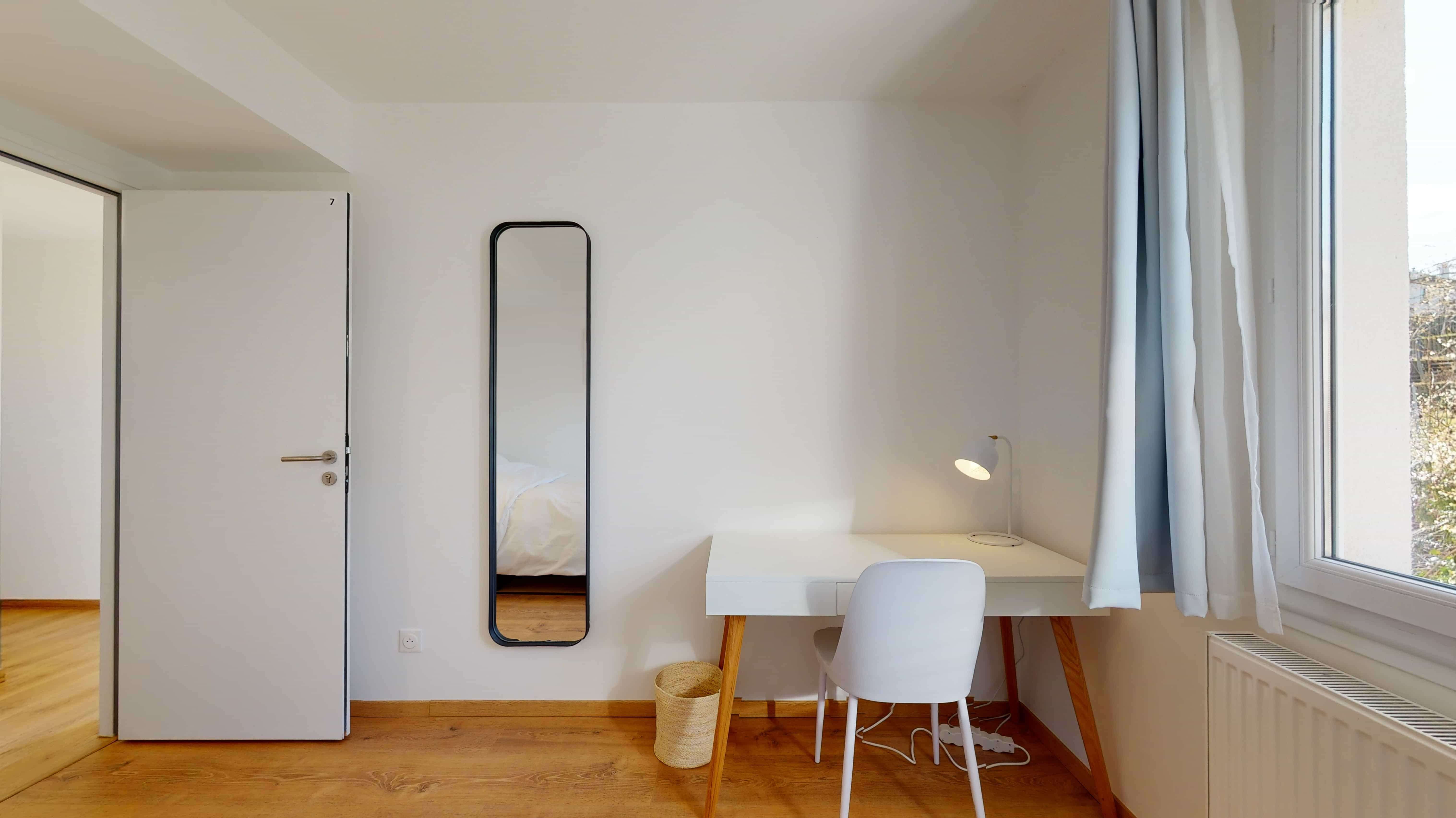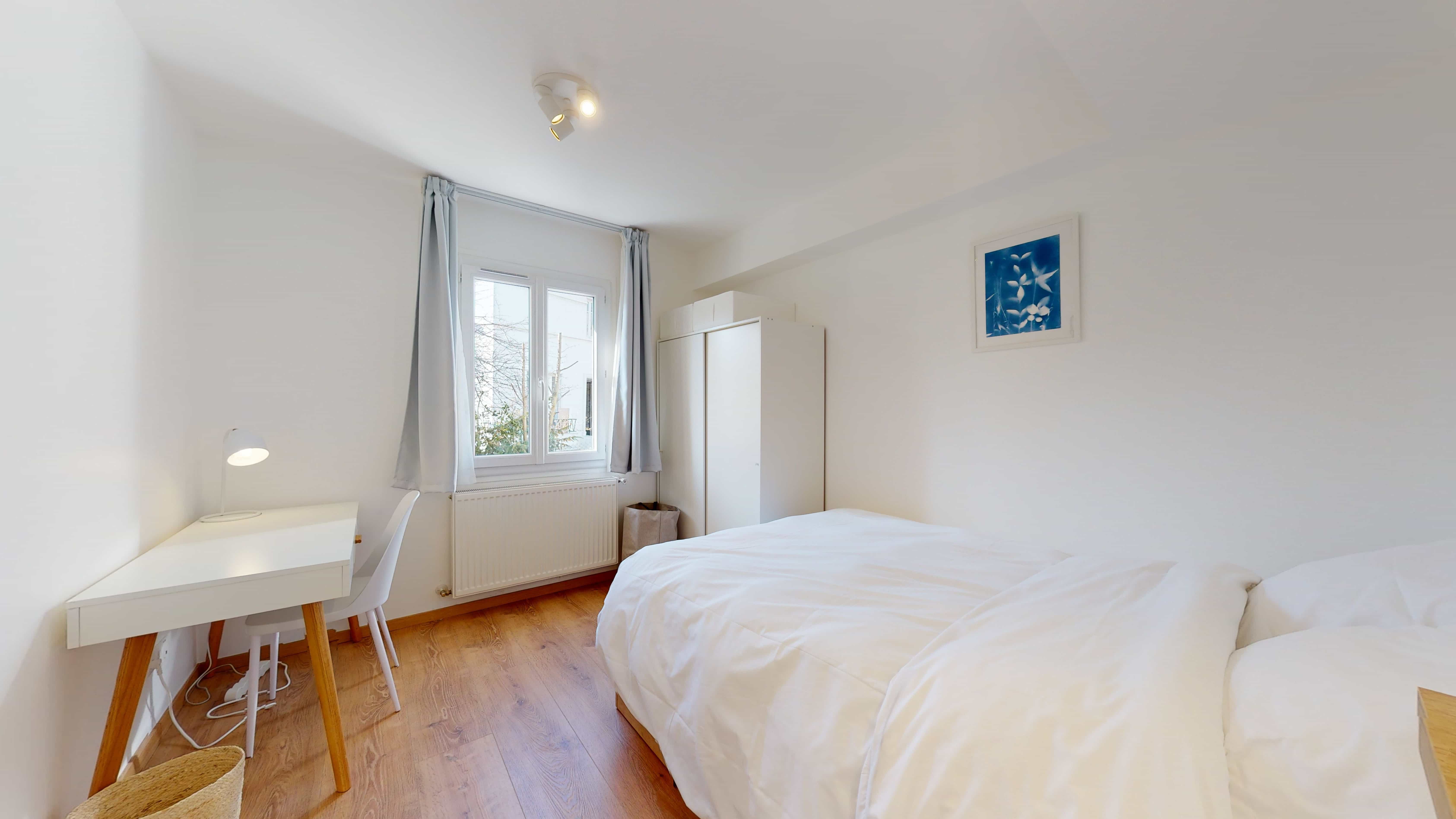 La chambre "Room for one person - 7", située au premier étage, est conçue pour offrir confort et intimité. Elle est meublée d'un lit double avec rangement intégré, d'une armoire pour vos vêtements, d'une chaise confortable et d'un bureau pour travailler ou étudier. La chambre partage une salle de bain moderne avec douche avec un autre locataire. Vous y trouverez également un radiateur pour les jours plus frais et tout le nécessaire de literie de qualité.