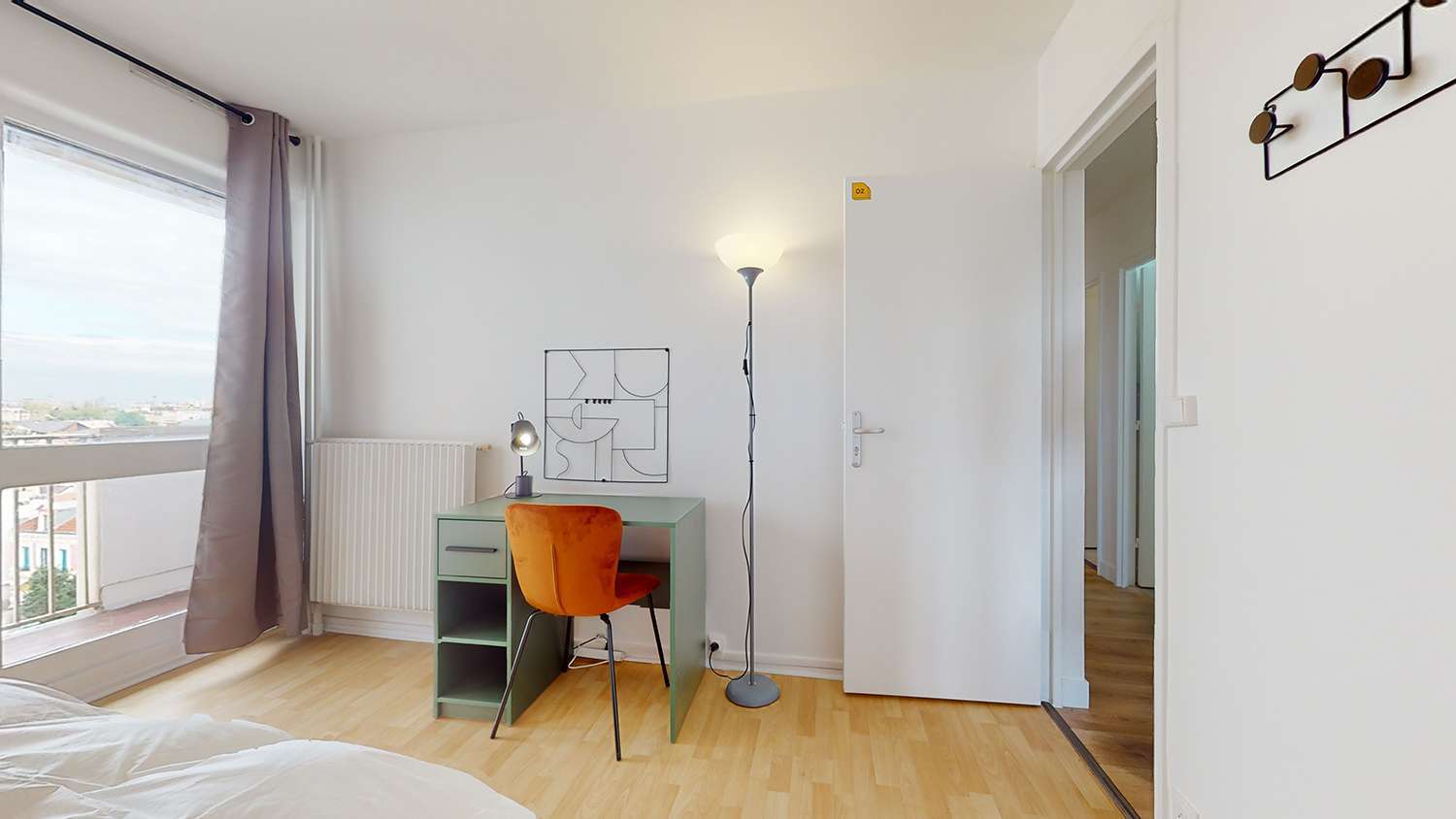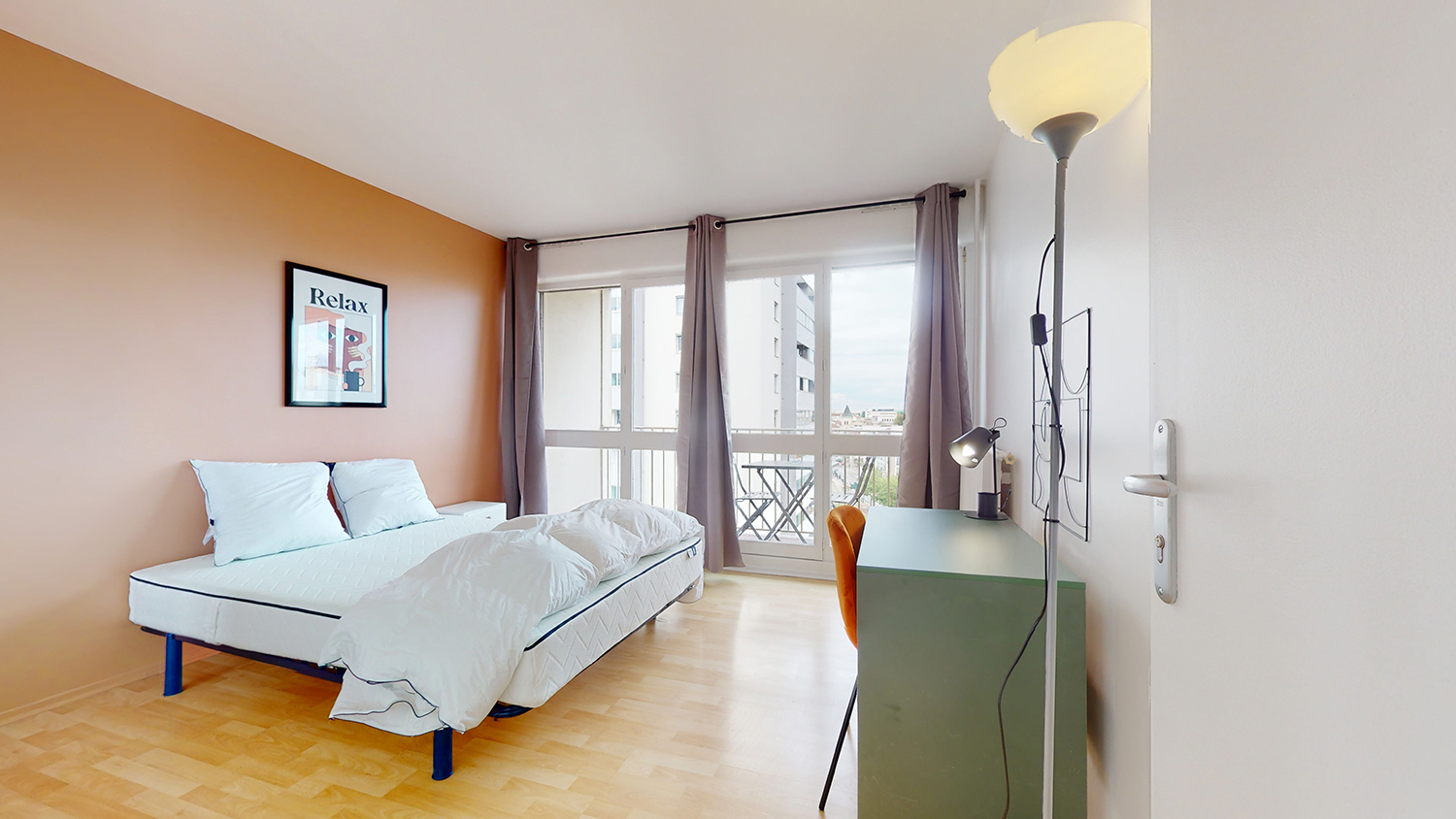 La chambre Room 2 est parfaite pour une personne. Elle a tout ce qu'il faut : un lit double confortable, une armoire pour vos vêtements, un bureau et une chaise pour travailler ou étudier, et même un balcon privé. La chambre partage une salle de bain moderne avec d'autres locataires, garantissant votre confort au quotidien.