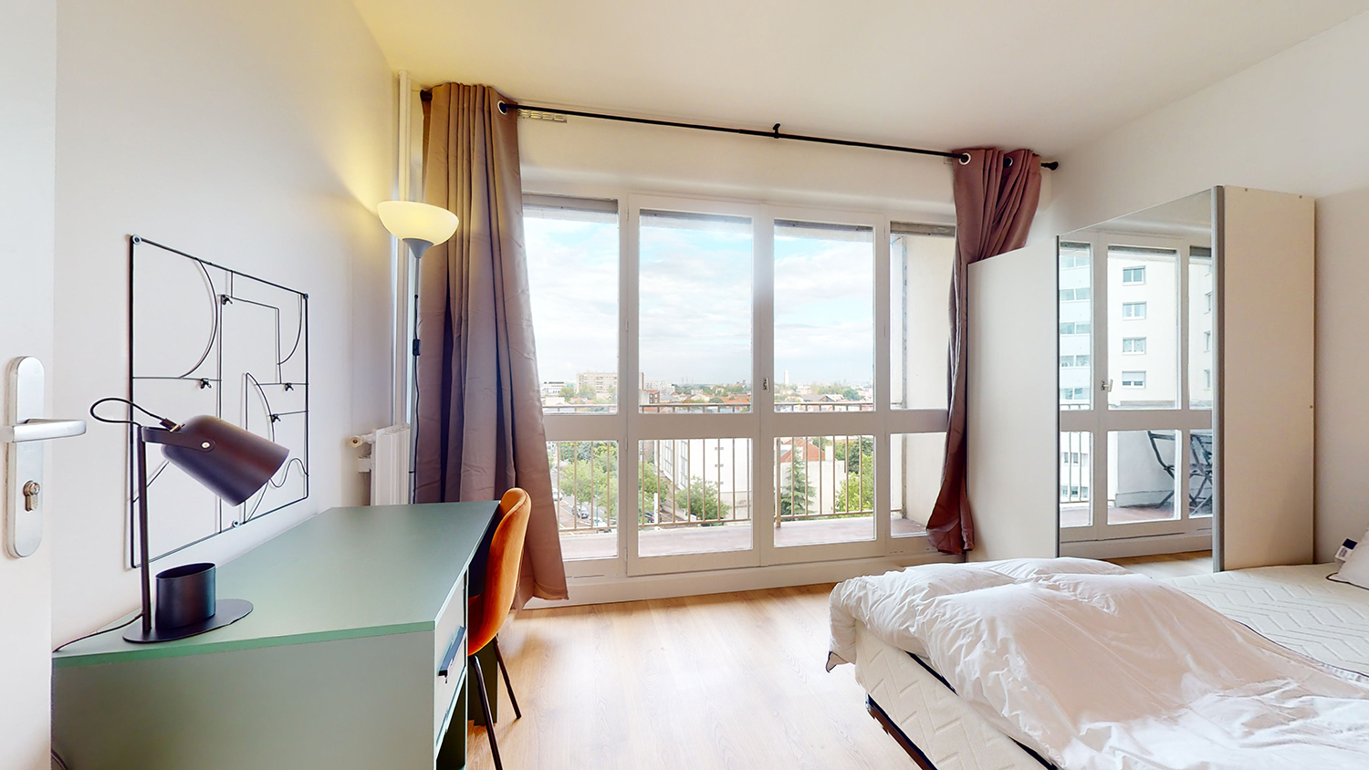 La chambre Room 5 est un espace personnel juste pour vous. Elle est meublée d'un lit double confortable, d'une armoire pour vos affaires, d'un bureau et d'une chaise pour travailler ou étudier. Vous aurez aussi accès au balcon pour prendre l'air. La salle de bain est partagée avec d'autres locataires et offre tout le nécessaire.