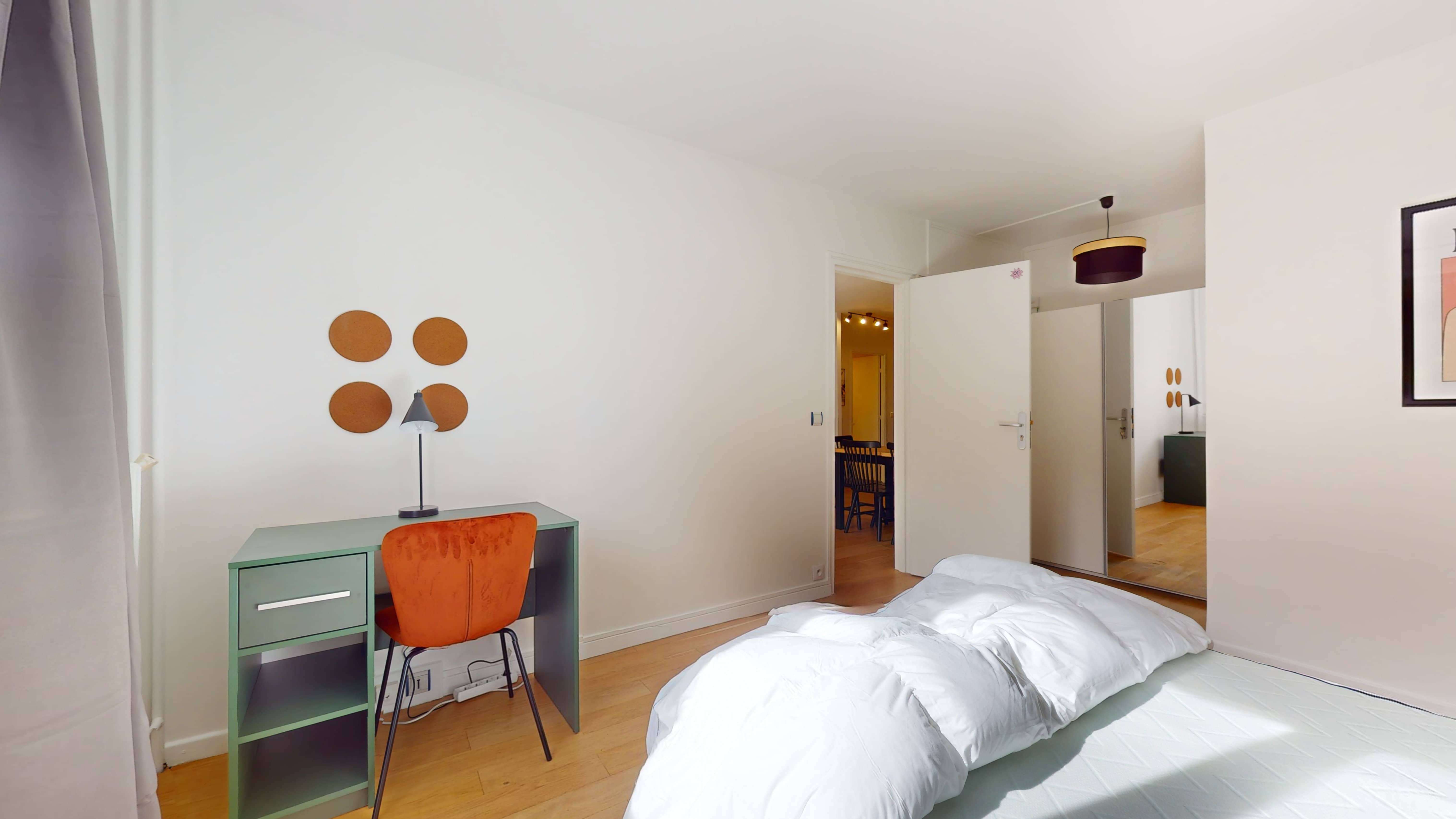 La chambre, nommée Room 1, est un petit cocon de 15 m² conçu pour une personne. Elle est meublée d'un confortable lit double, d'une armoire pour vos vêtements, ainsi que d'un bureau et une chaise pour travailler ou étudier en toute tranquillité. Vous y trouverez également tout le nécessaire pour votre confort quotidien, comme une lampe de bureau et des rideaux pour une bonne nuit de sommeil.