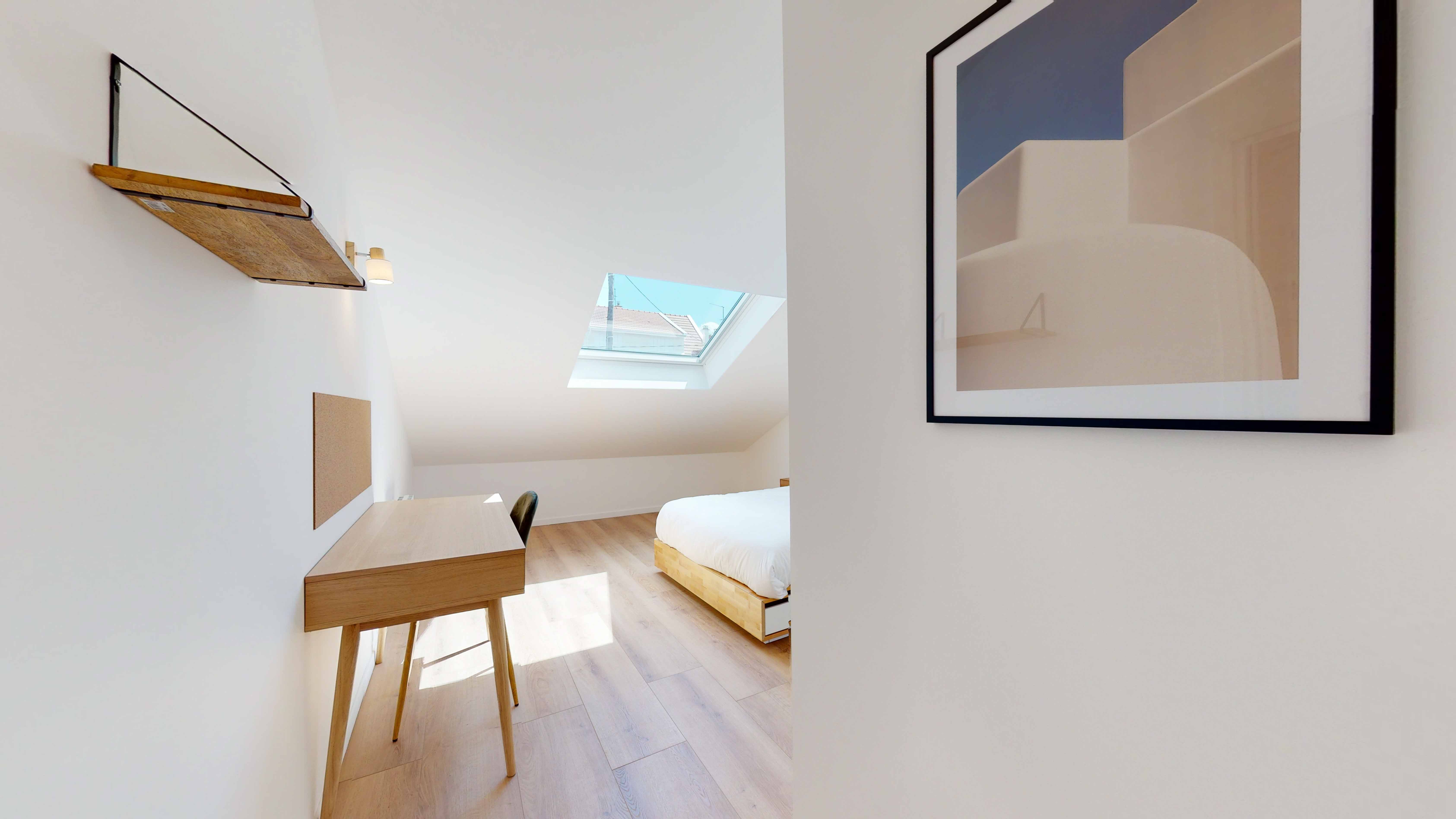 La chambre "Room for one person - 11" est un cocon douillet situé au premier étage. Elle est parfaite pour une personne avec son lit double confortable, sa table de nuit avec lampe, son bureau pour travailler ou étudier, et une armoire pour ranger vos affaires. La chambre partage une salle de bain moderne avec douche et lavabo avec un autre locataire.