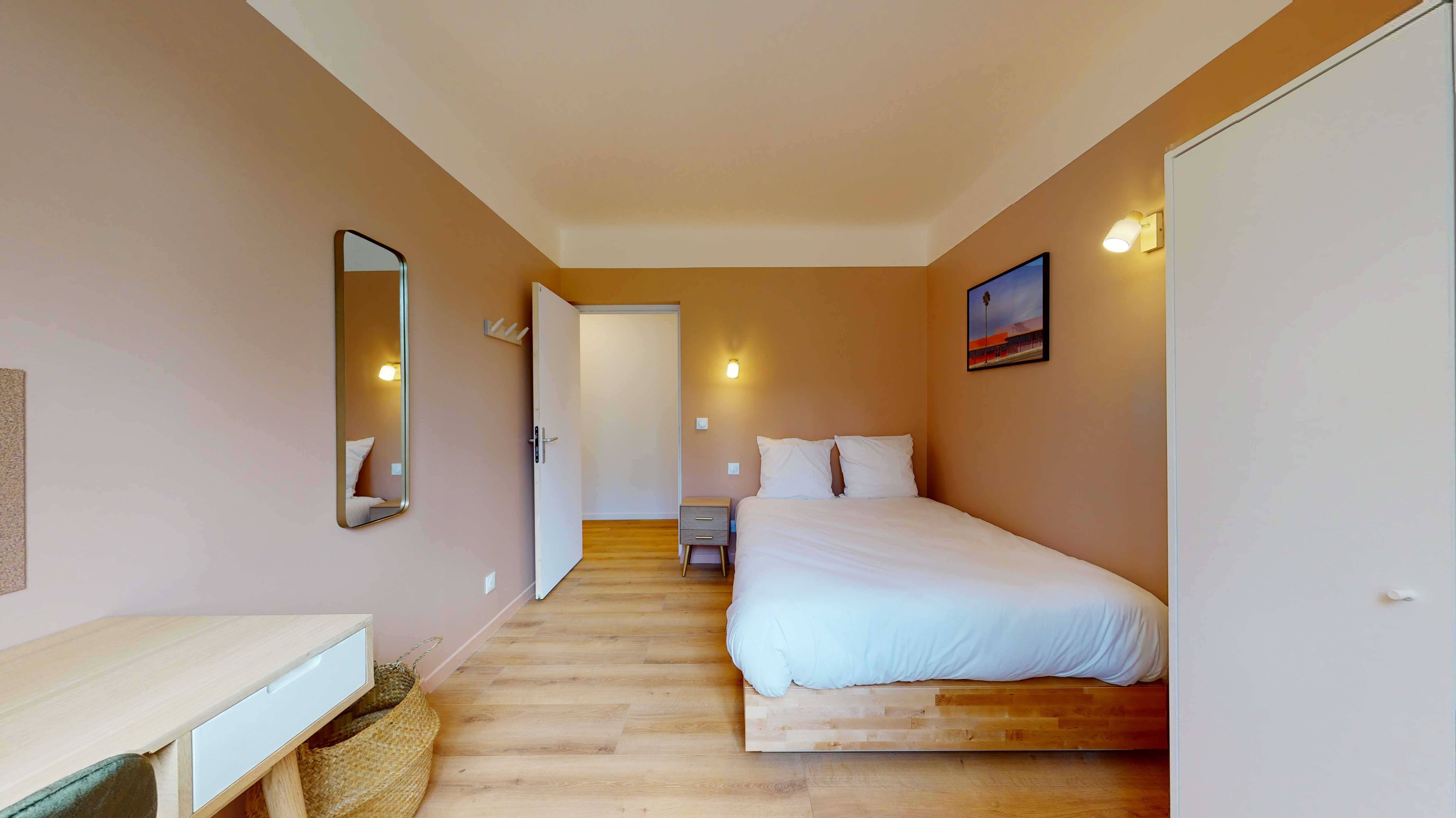 La chambre "Room for one person - 3" est un cocon douillet situé au rez-de-jardin. Conçue pour une personne, elle est équipée d'un confortable lit double avec de la literie de qualité, d'une armoire pour vos affaires, d'une table et d'une chaise pour travailler ou étudier. La chambre partage une salle de bain moderne avec douche et lavabo avec un autre locataire.