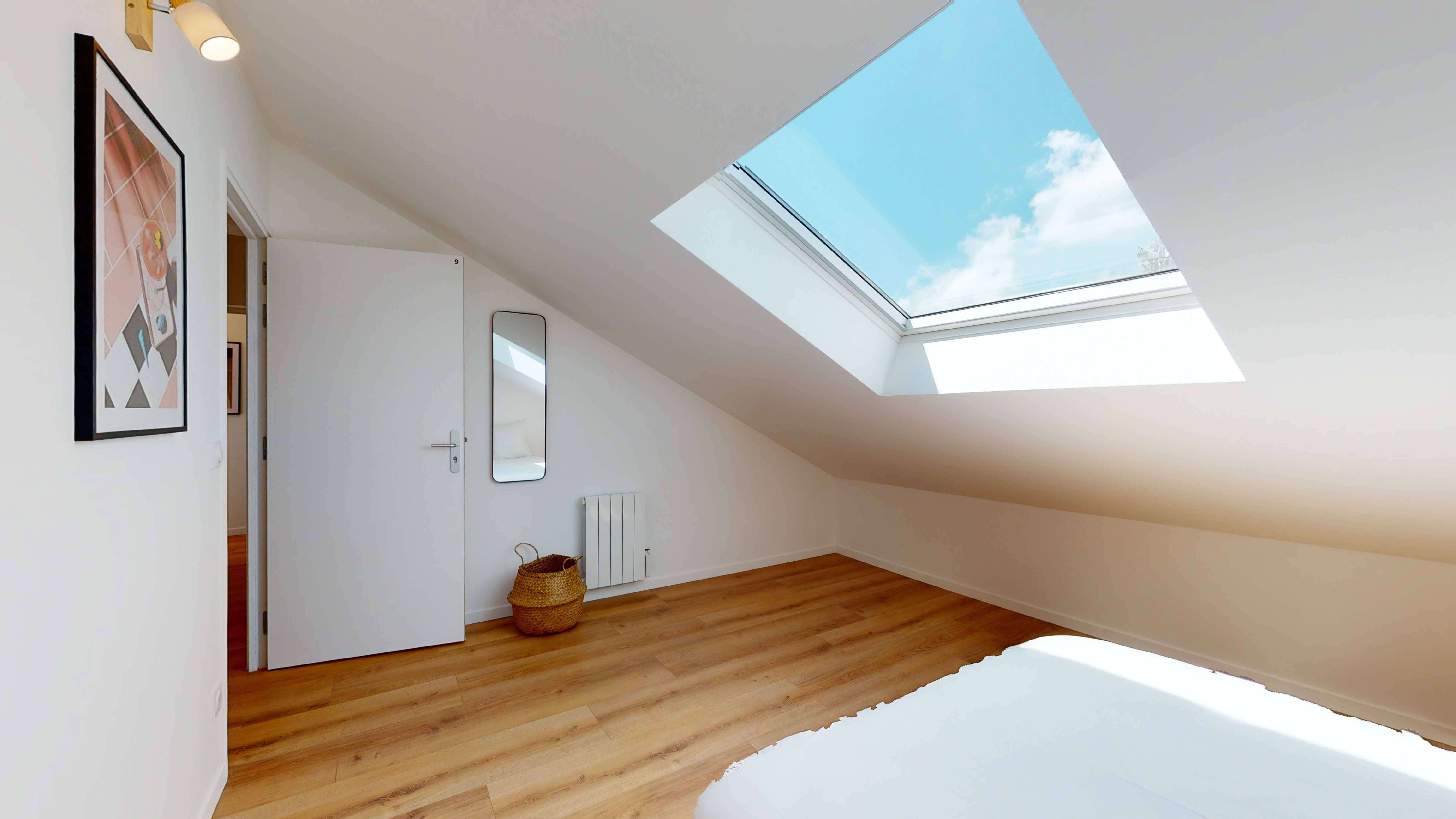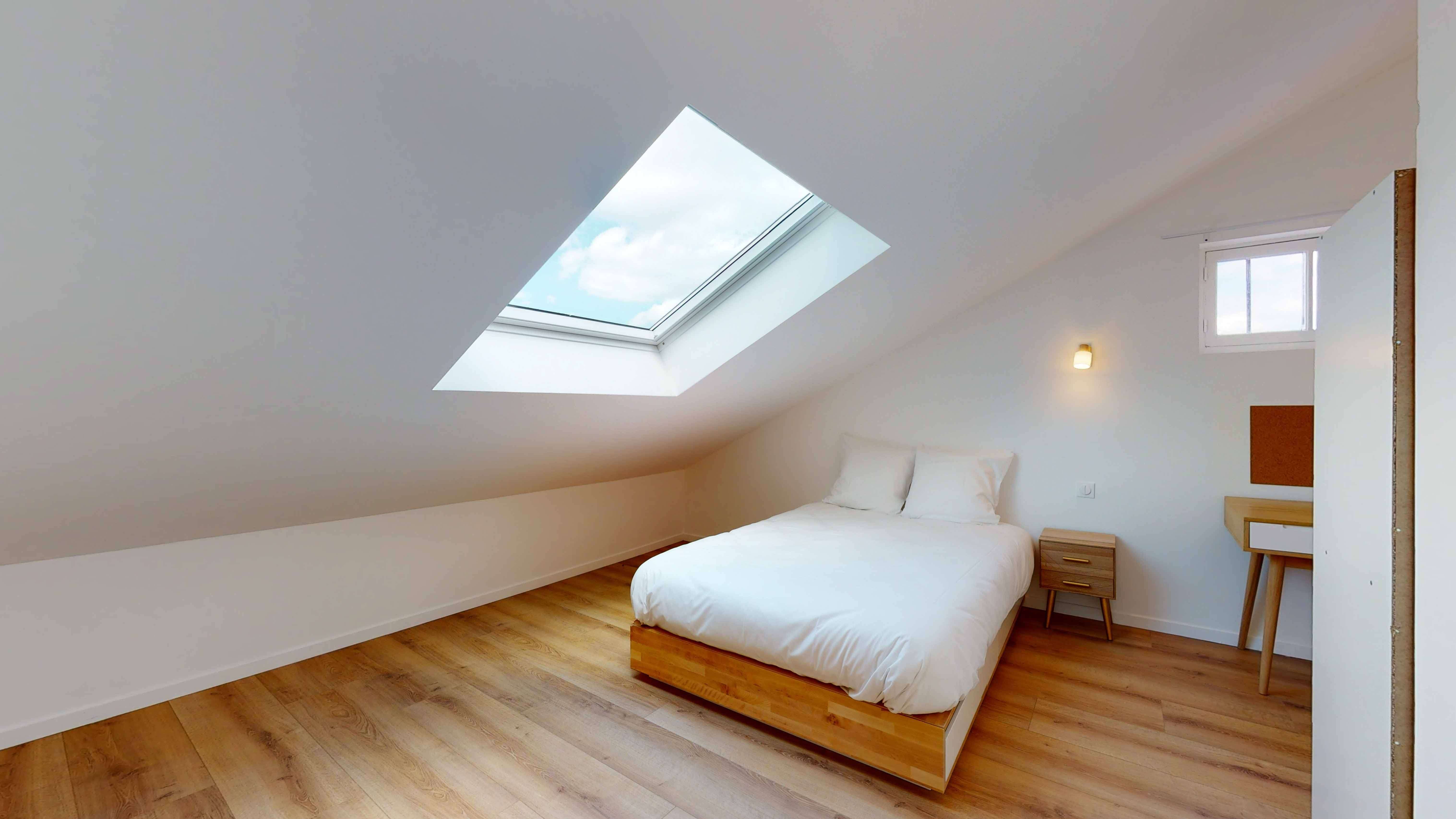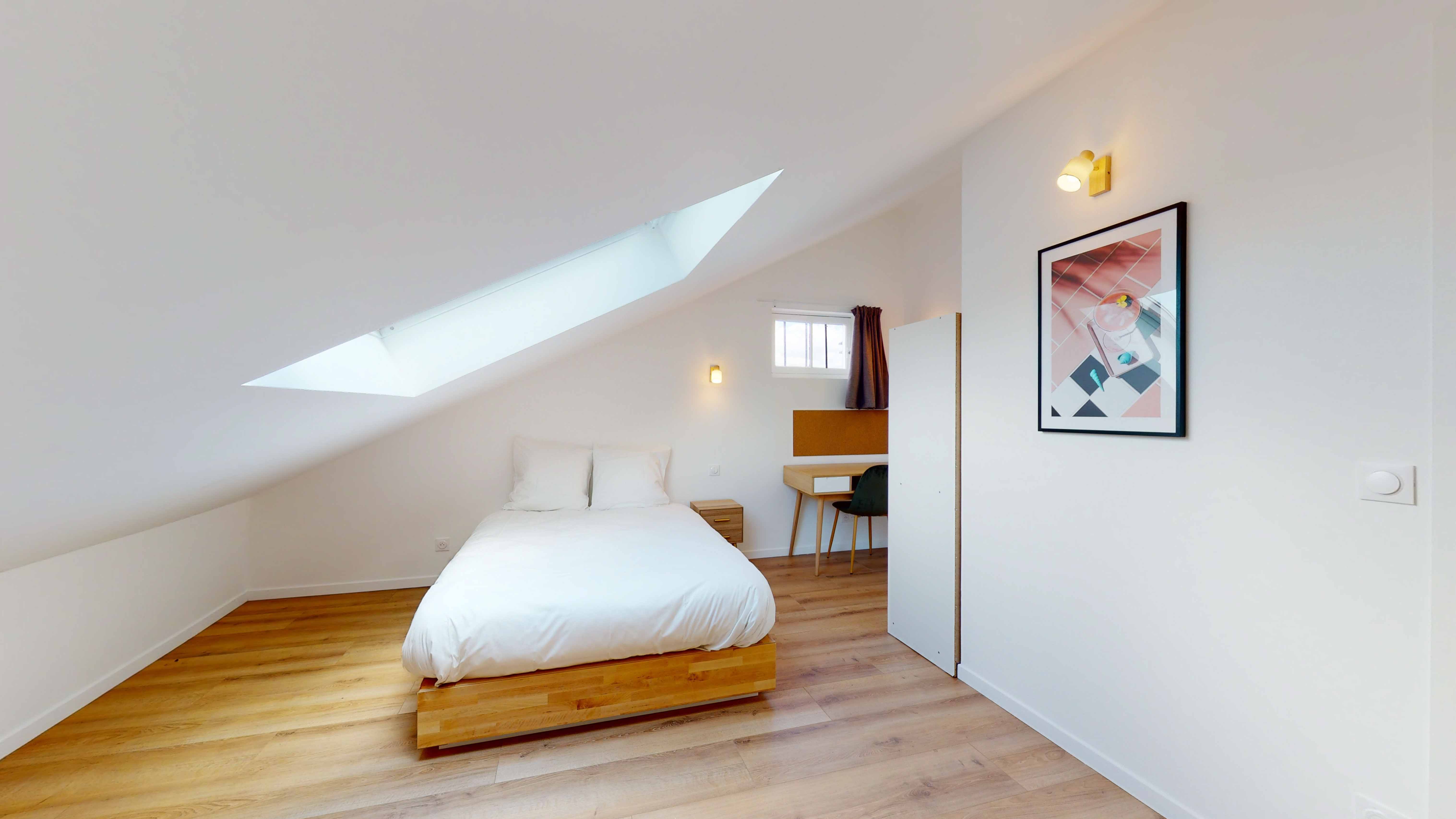 La chambre "Room for one person - 9" est un cocon douillet de 9m2 situé au premier étage. Elle est parfaite pour une personne avec son lit double confortable, son armoire pour ranger vos affaires, une table et une chaise pour travailler ou étudier. La chambre partage une salle de bain moderne avec douche et lavabo avec un autre locataire. La qualité de la literie et le chauffage inclus assurent un confort optimal.