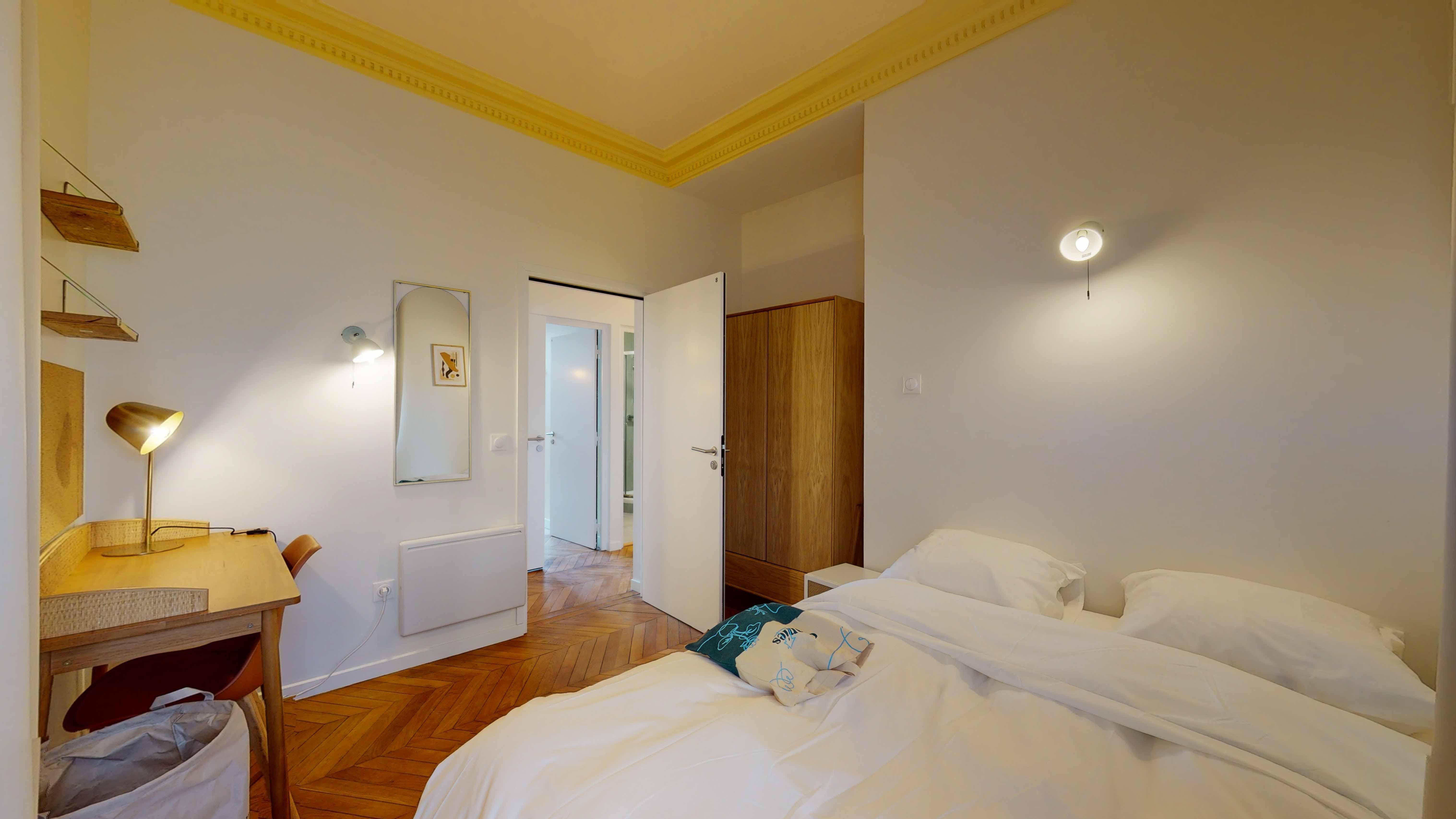 La chambre "Room for one person - 8" est un cocon douillet de 10m2 situé au rez-de-chaussée. Elle est meublée d'un lit double avec rangement intégré, d'une armoire pour vos affaires, d'un bureau et d'une chaise pour travailler ou étudier, ainsi que d'une lampe de bureau et d'une lampe de chevet. La salle de bain est partagée avec un autre locataire et comprend une douche moderne.