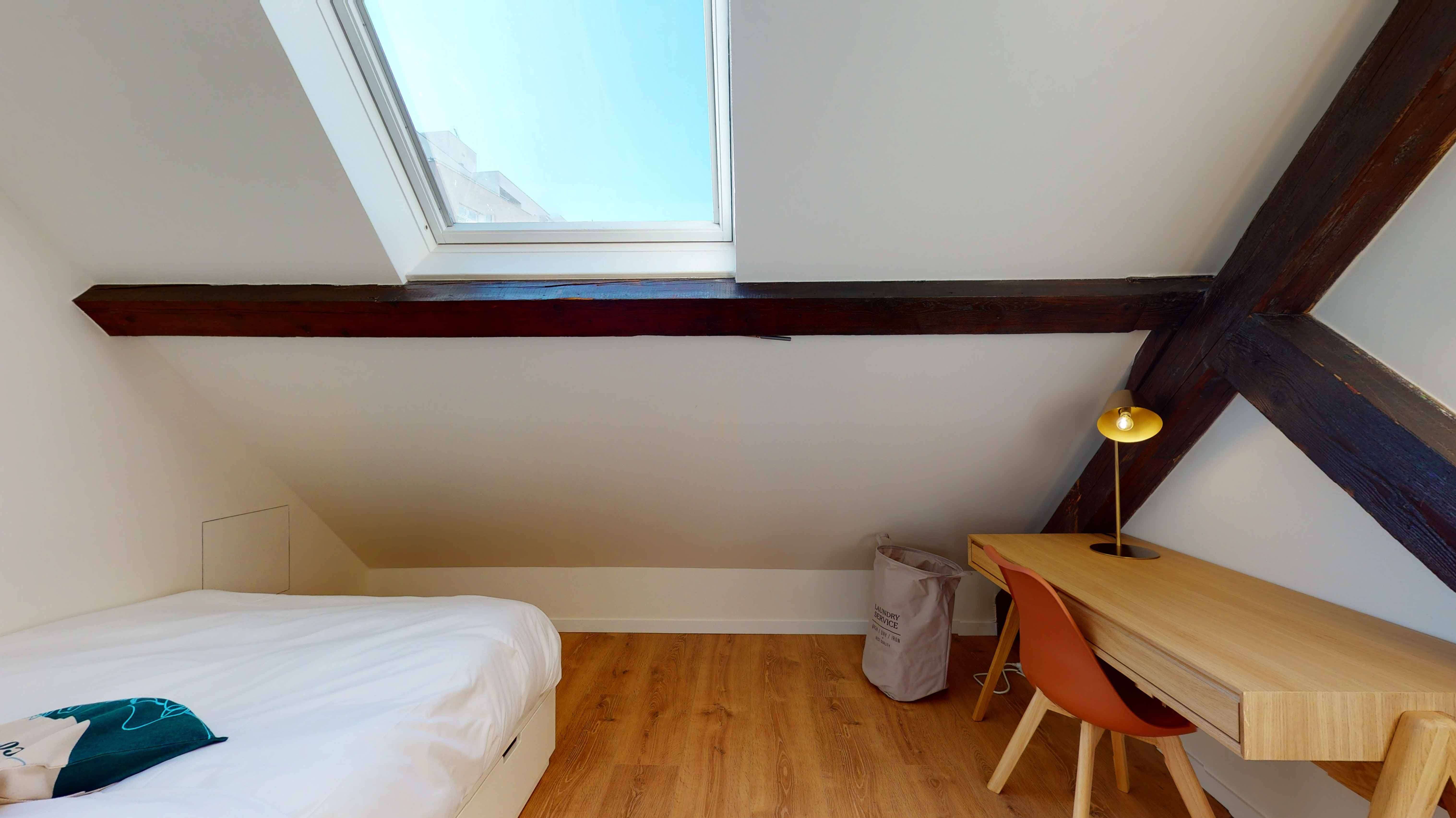 Votre future chambre, située au premier étage, est une unité privée conçue pour une personne. Elle est meublée d'un lit double avec literie de qualité et rangements intégrés, d'une armoire spacieuse, d'un bureau accompagné d'une chaise confortable et d'une lampe de bureau pour vos sessions de travail ou de lecture. La salle de bain est partagée avec un autre locataire et comprend une douche moderne.