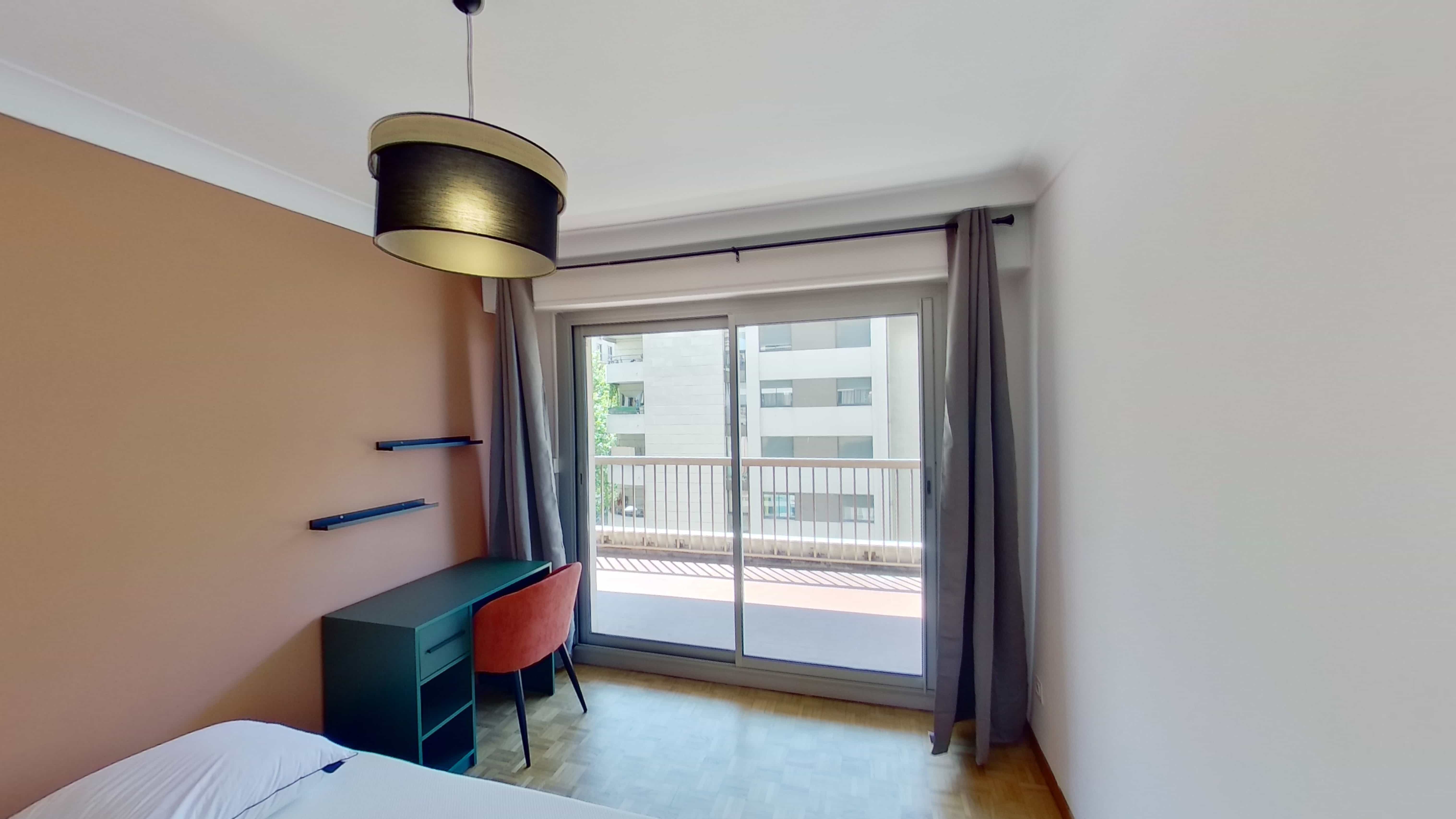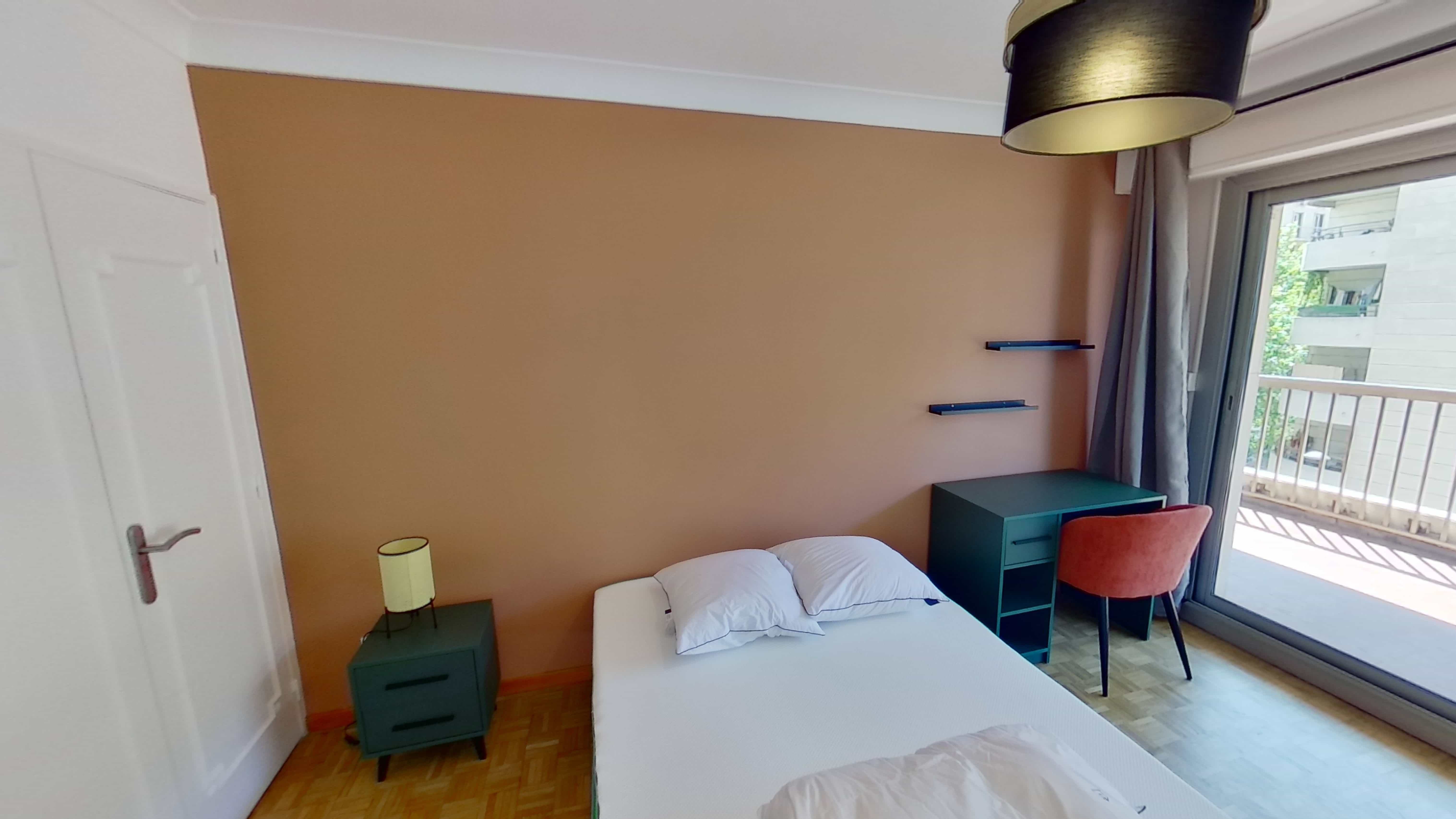 La chambre Room 3, de 14 m², est un espace personnel pensé pour votre confort. Elle dispose d'un lit double avec de la literie de qualité, une grande armoire pour toutes vos affaires, un bureau avec une lampe pour étudier ou travailler et un balcon pour prendre l'air. La salle de bain est partagée avec d'autres locataires et offre tout le nécessaire.