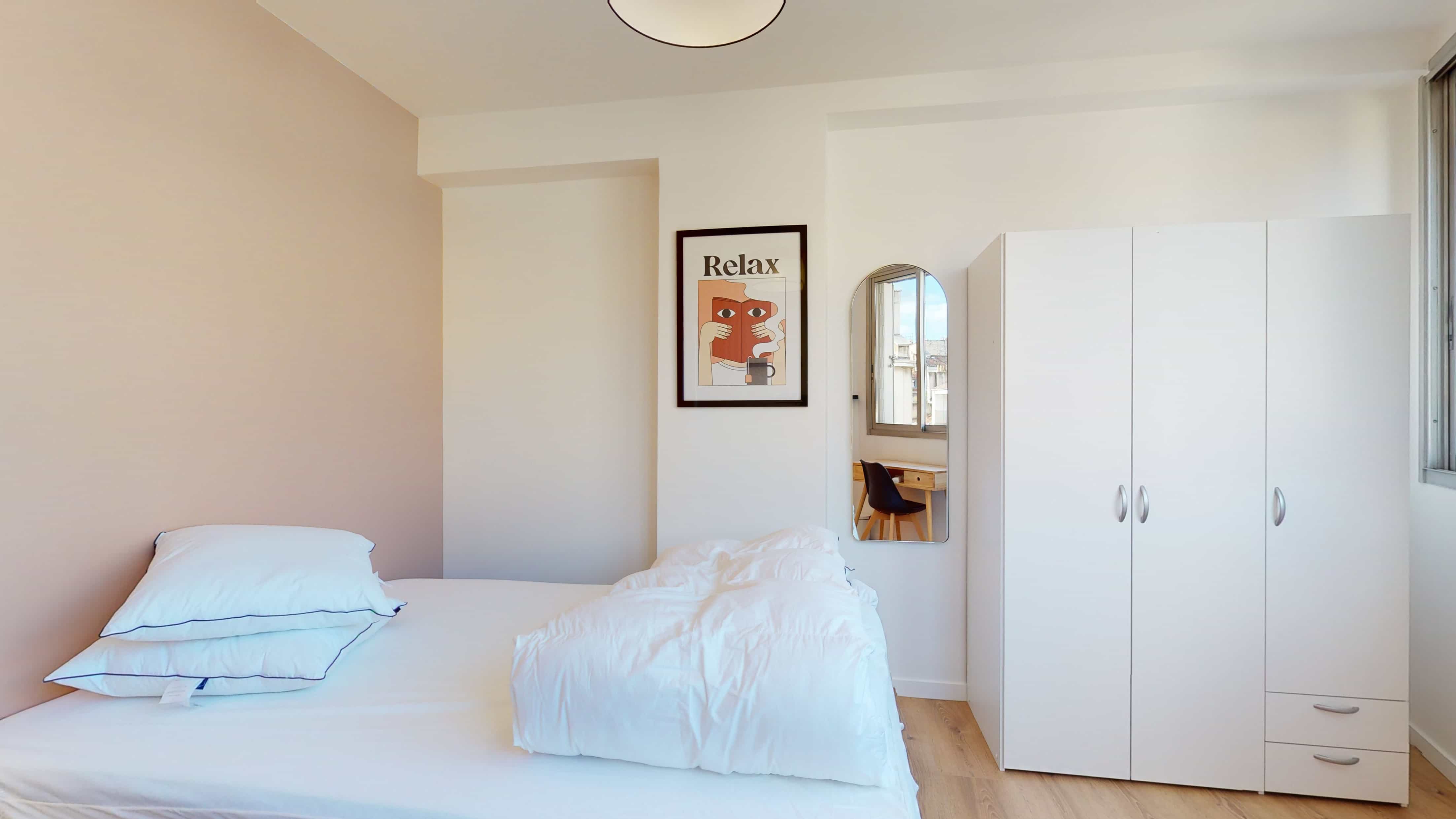 La chambre que nous proposons, nommée "Room 2", est idéale pour une personne. Elle est meublée avec un lit double confortable, une grande armoire pour vos affaires, une chaise et un bureau pour travailler ou étudier. La chambre de 10 m² partage une salle de bain moderne avec douche et toilettes avec les autres colocataires.