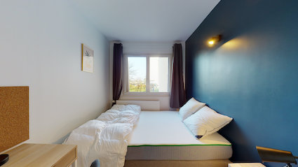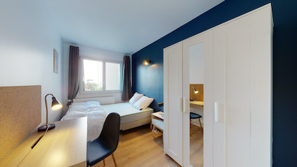 Room 5 est une chambre douillette conçue pour une personne. Elle a tout ce qu'il faut : un lit double confortable avec de la literie de qualité, une armoire pour vos vêtements, un bureau pour travailler et une chaise. Elle a aussi une table de nuit avec une lampe et un radiateur pour rester au chaud. La salle de bain (avec douche, lavabo et toilettes) est à partager avec d'autres locataires.