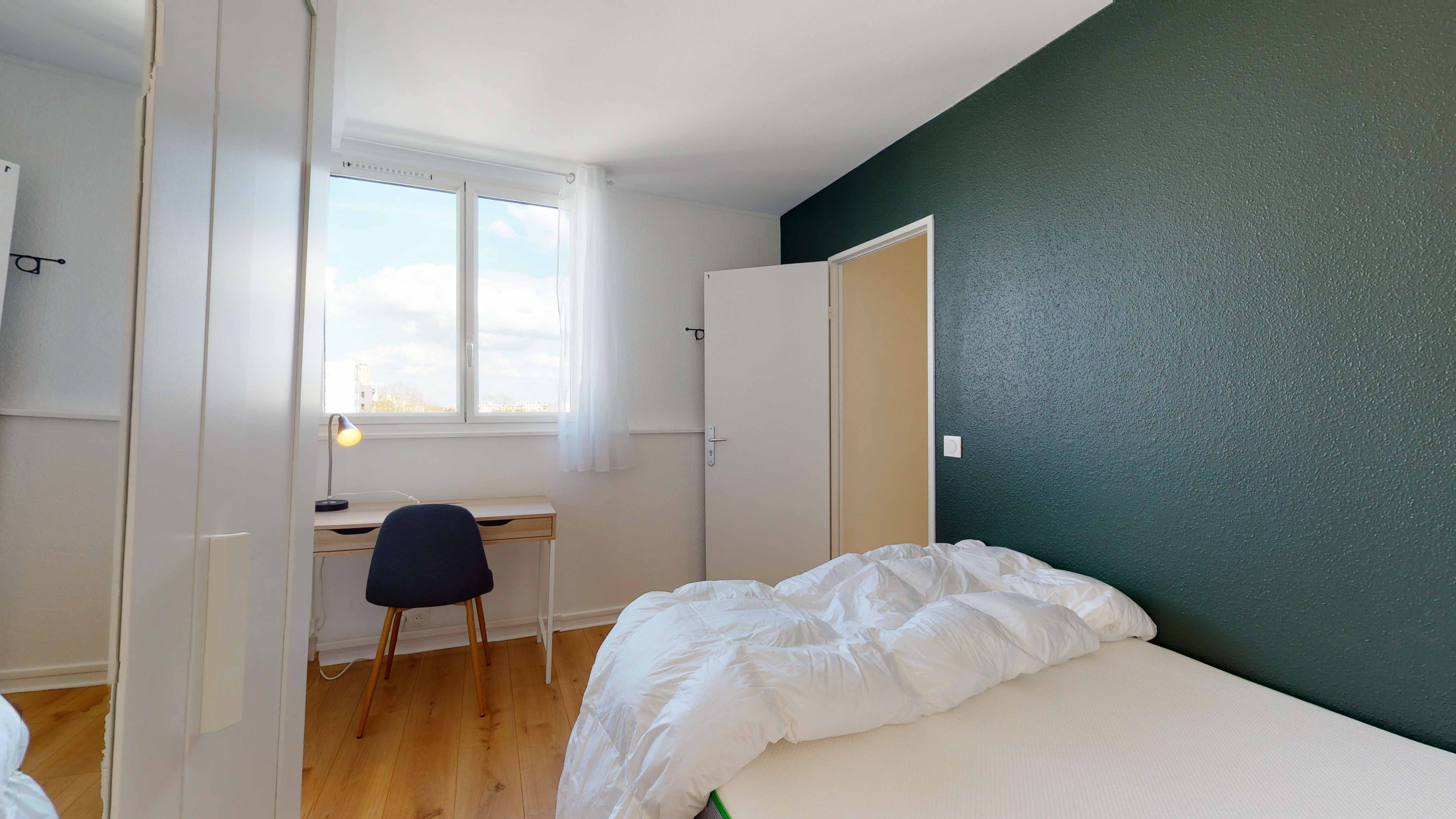 Room 1 est une chambre douillette de 9 m², pensée pour une personne. Elle est équipée d'un lit double confortable avec une literie de qualité, d'une armoire pour vos affaires, d'une chaise et d'un bureau pour travailler ou étudier. La chambre partage une salle de bain bien entretenue avec douche, lavabo et toilettes avec les autres colocataires.