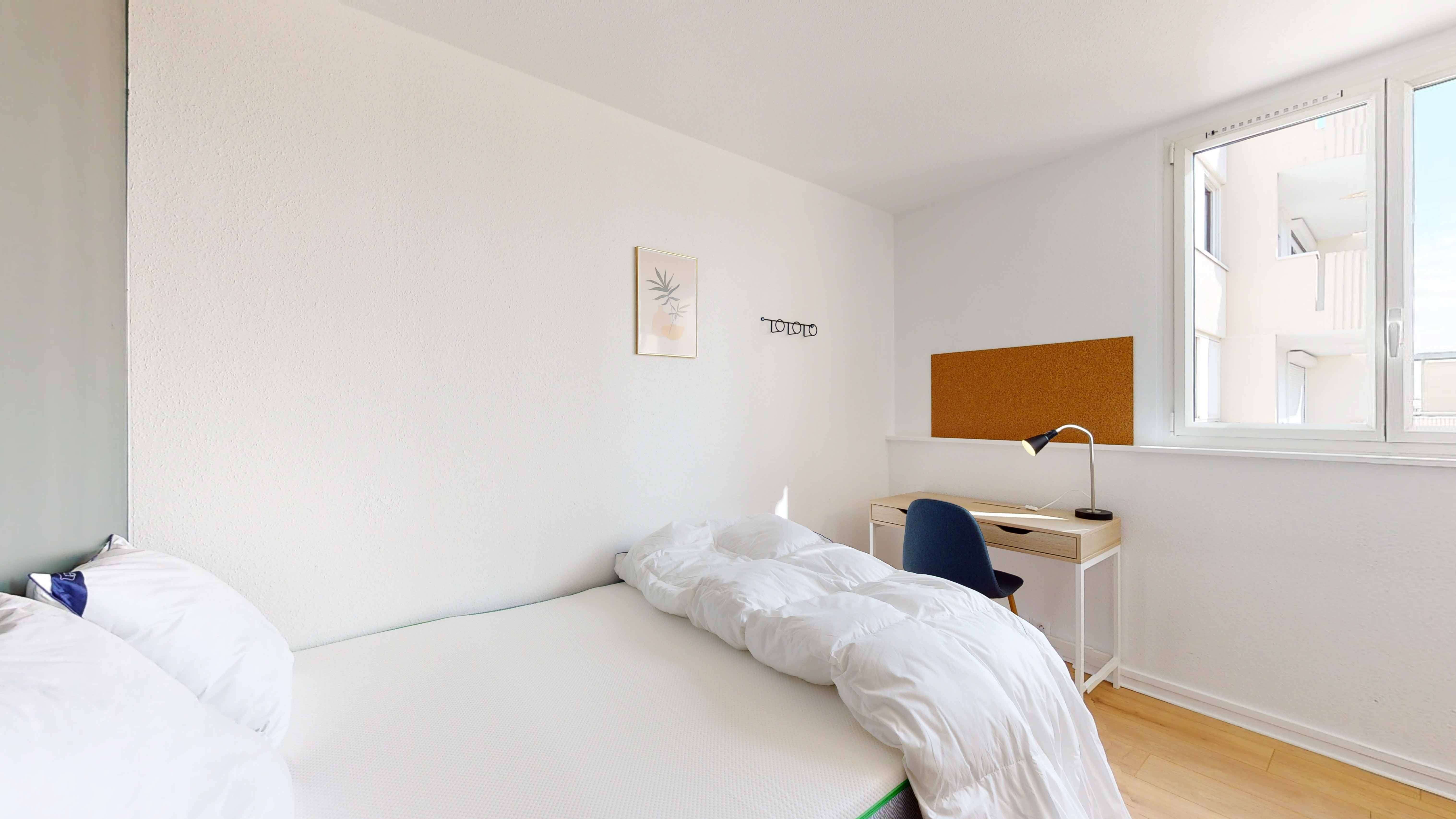 La chambre Room 6 est un espace privé rien que pour vous. Elle est bien aménagée avec un lit double confortable, une grande armoire pour toutes vos affaires, une chaise, un bureau pour travailler ou étudier, et une lampe de bureau. La chambre mesure 9 m² et partage une salle de bain moderne avec d'autres locataires.