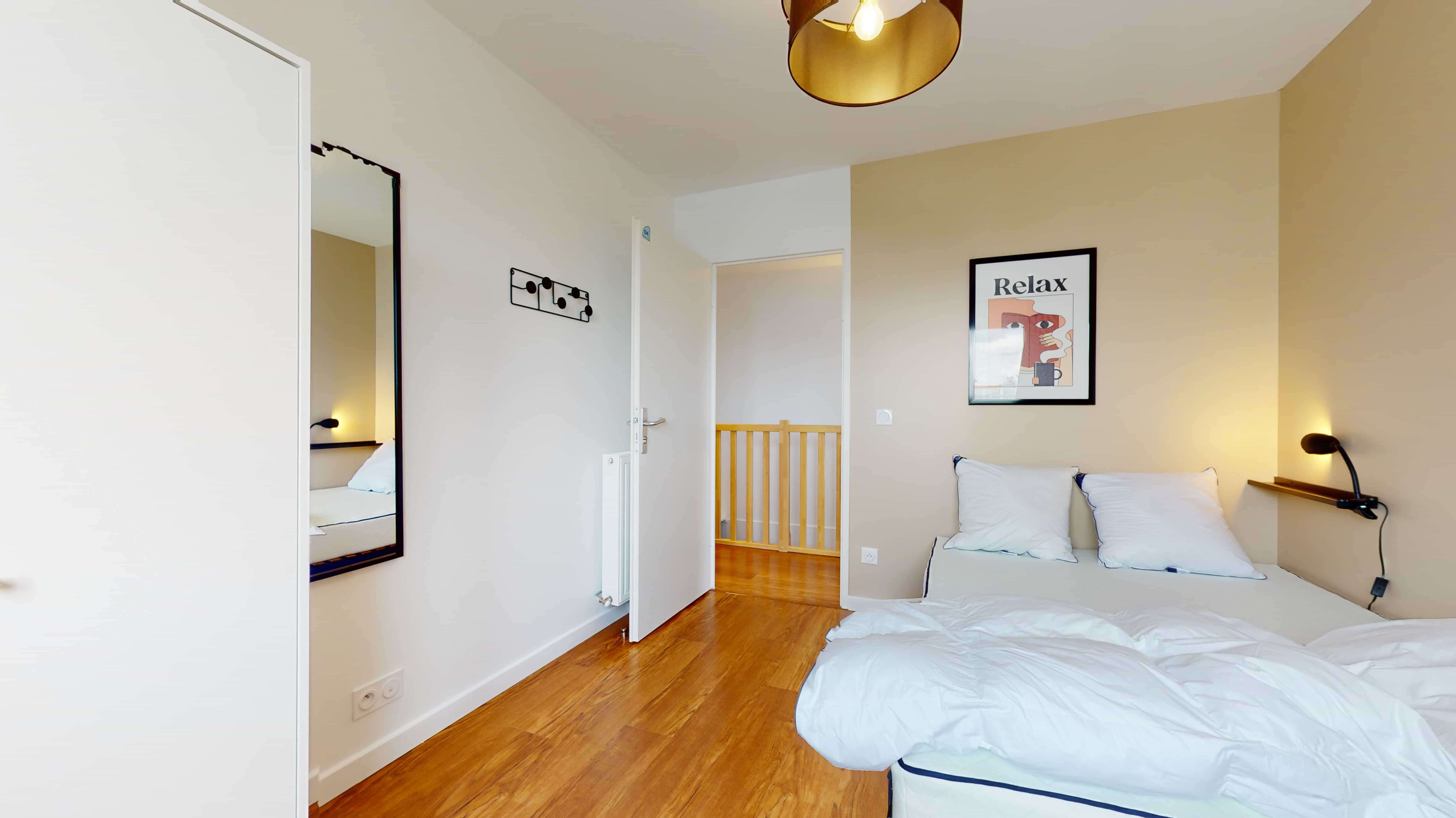 La chambre "Room 4", d'une superficie de 11 m², est spécialement conçue pour une personne. Elle comprend un lit double confortable avec de la literie de qualité, une armoire spacieuse pour vos affaires, ainsi qu'un bureau et une chaise pour travailler au calme. La chambre partage une salle de bain bien équipée avec d'autres locataires.