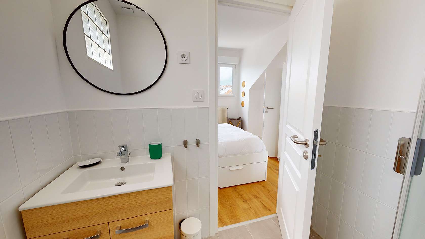 La chambre 17, située au deuxième étage, est un cocon parfait pour une personne. Elle est équipée d'un lit double confortable avec rangement intégré, d'une penderie pour vos vêtements, d'une table et d'une chaise pour travailler ou étudier, ainsi que d'une lampe de chevet et d'une lampe de bureau pour vos soirées de lecture. La salle de bains privée comprend une douche moderne, un lavabo et des toilettes. Un radiateur assure votre confort thermique tout au long de l'année.