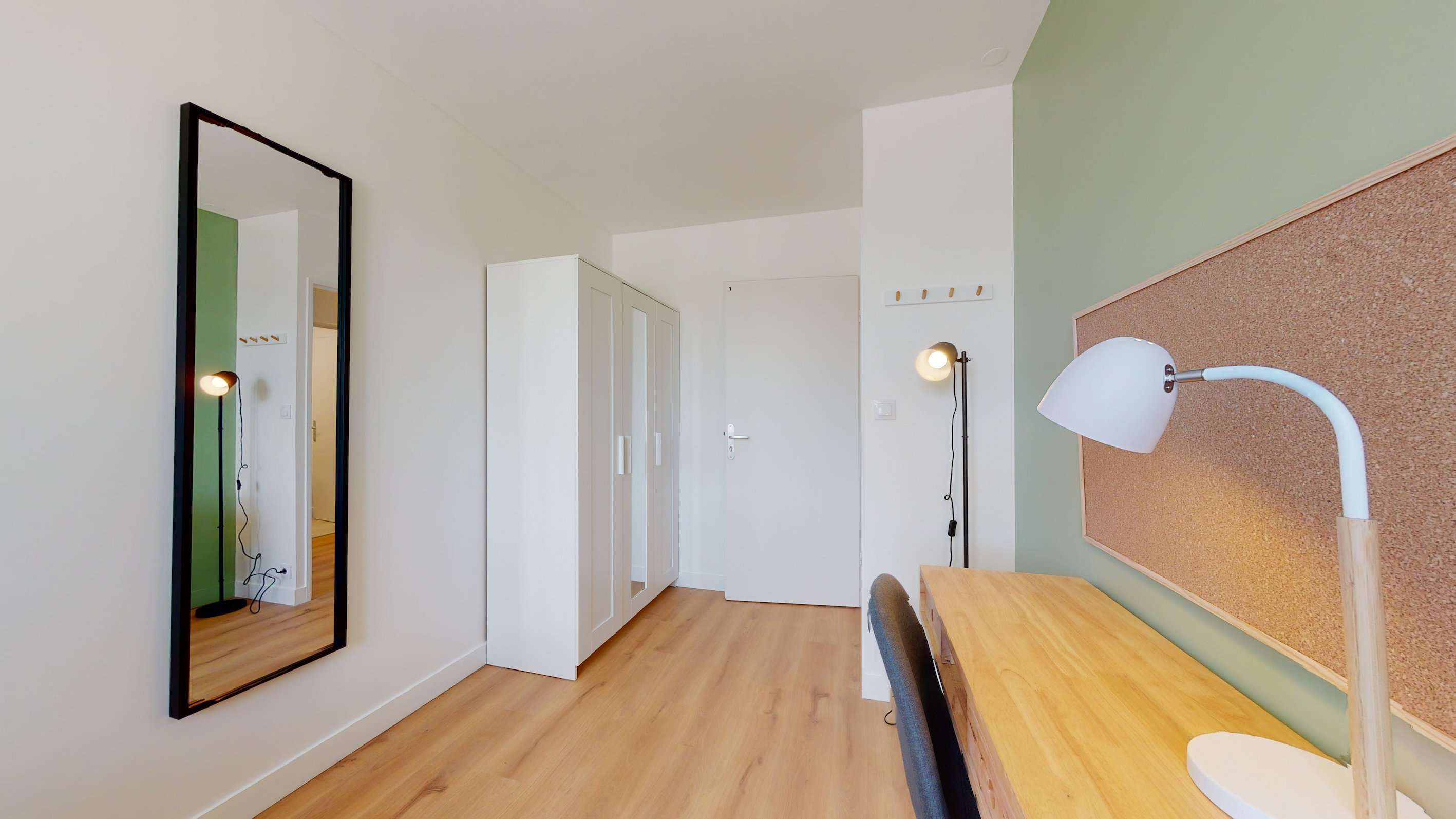 La chambre Room 1 est parfaite pour une personne. Elle est meublée d'un lit double avec une literie de qualité, d'une armoire pour ranger toutes vos affaires, ainsi que d'une chaise et d'un bureau pour étudier ou travailler en toute tranquillité. D'une superficie de 10 m², la chambre offre un espace personnel cosy et partage une salle de bain propre et fonctionnelle avec les autres locataires.