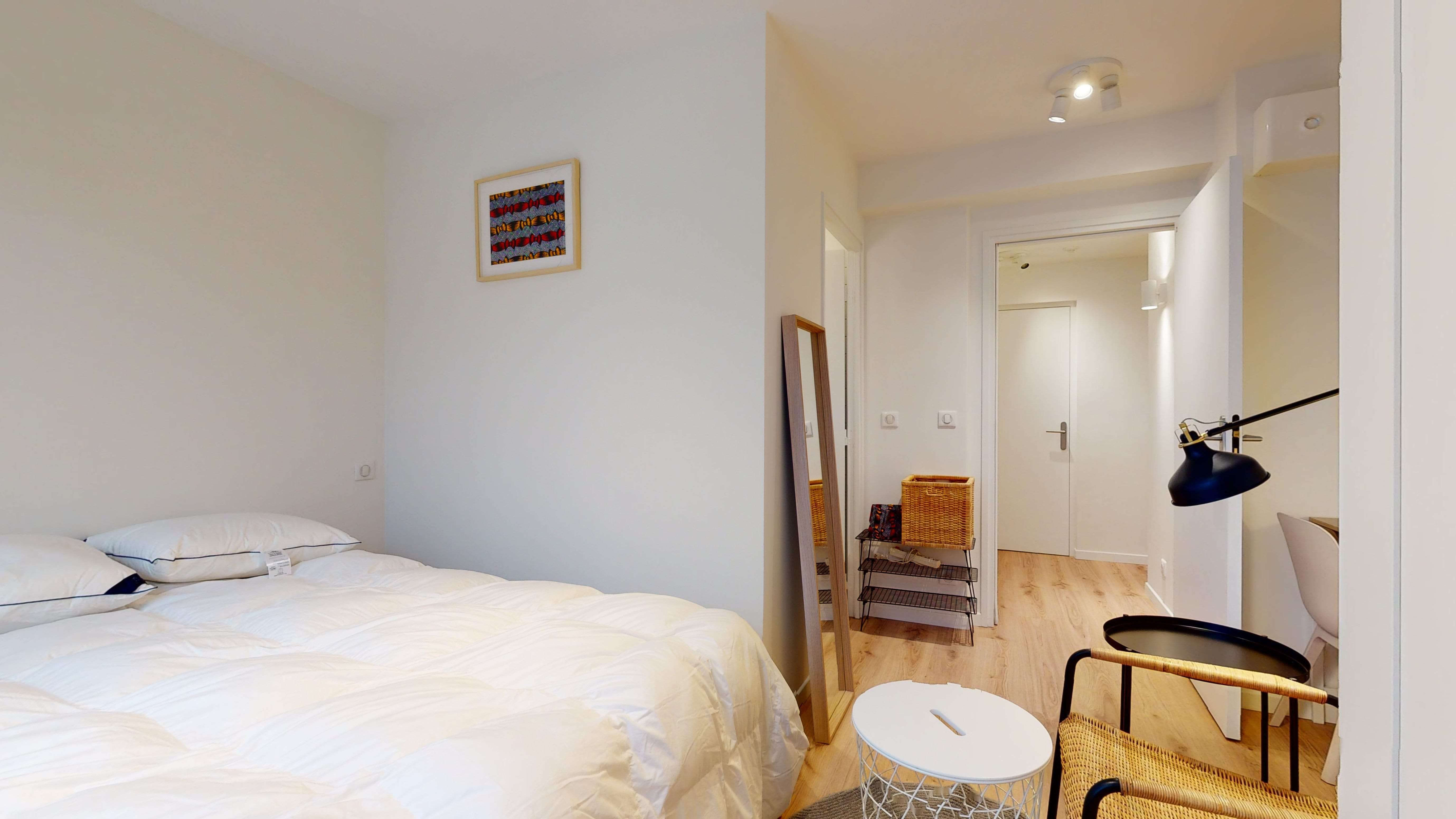 La chambre 4, située au rez-de-chaussée, est conçue pour une personne. Elle est équipée d'un lit confortable avec des rangements intégrés, d'une penderie pour vos vêtements, d'un fauteuil pour se relaxer et d'un bureau d'appoint pour travailler ou étudier. La salle de bain privée comprend une douche moderne et des toilettes. La chambre est également dotée d'un radiateur pour rester au chaud en hiver.