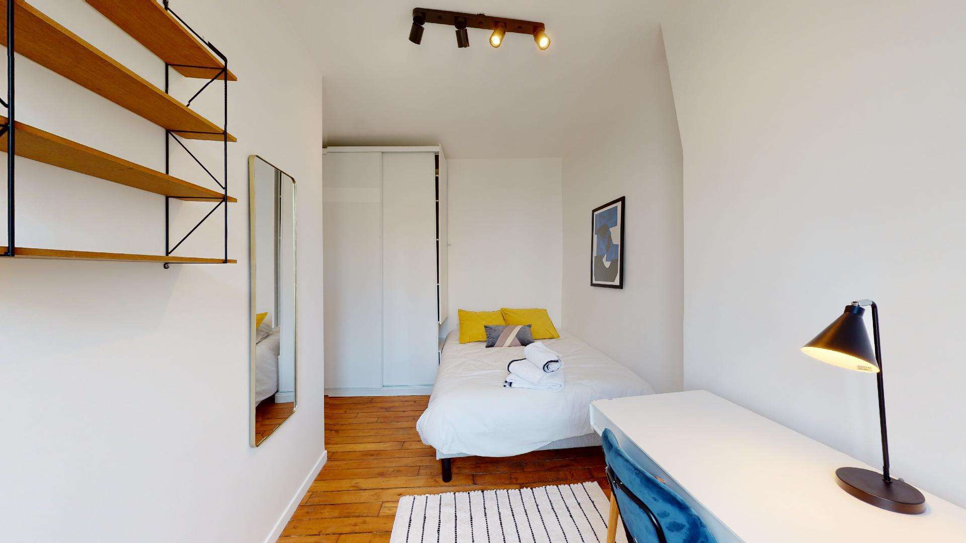La chambre, conçue pour une personne, est un petit cocon de 9 m² avec tout ce qu'il faut : un lit double confortable, une armoire pour vos vêtements, un bureau et une chaise pour travailler, ainsi qu'une lampe de chevet. La qualité est au rendez-vous sans être luxueuse. La salle de bains est à partager et comprend une douche et des toilettes.