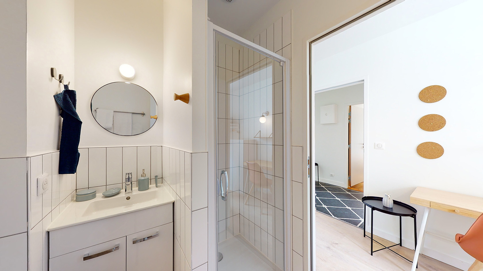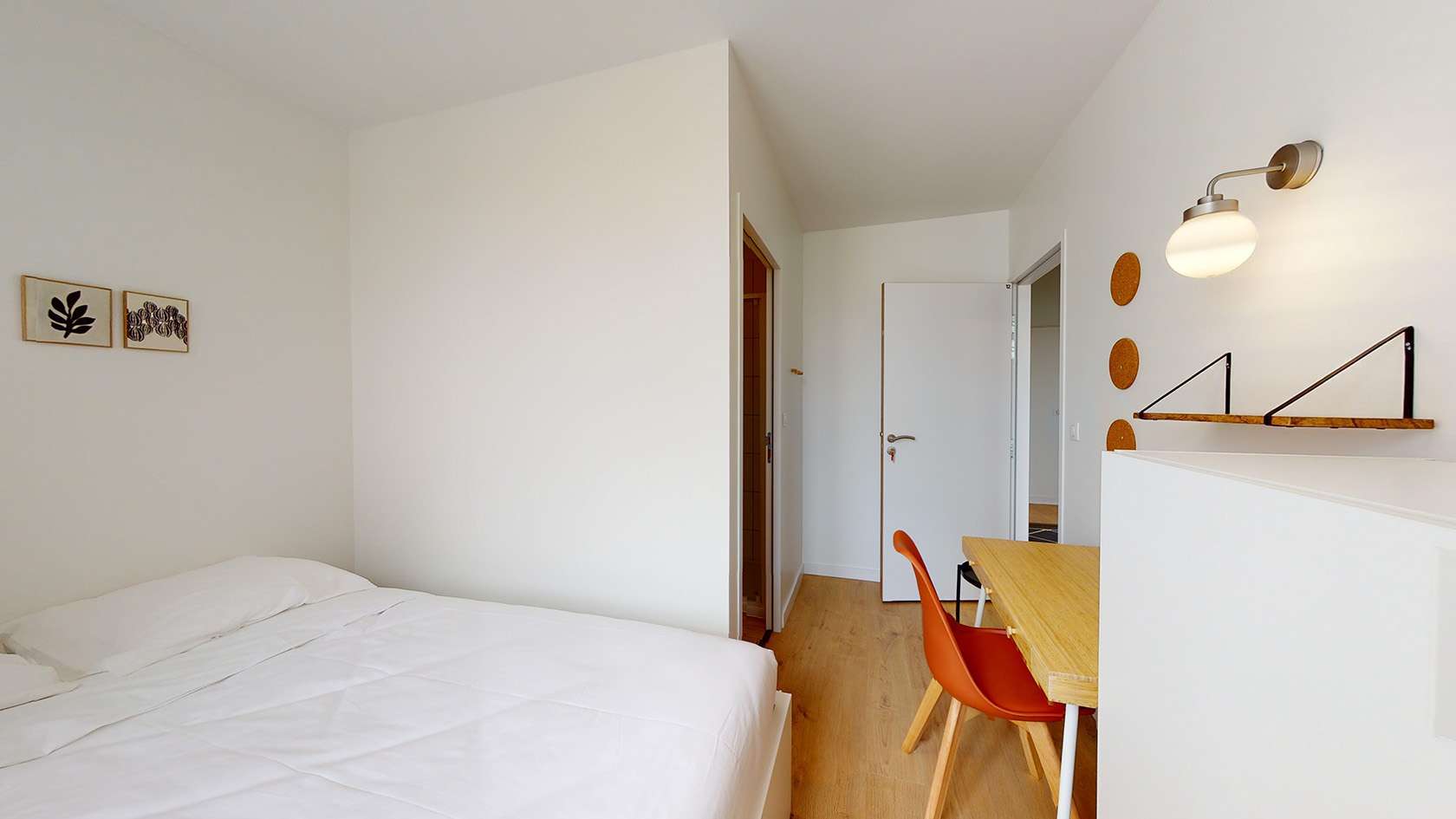 La chambre 12, située au deuxième étage, est un cocon juste pour vous. Elle est équipée d'un lit double avec rangement intégré, d'une armoire pour vos affaires, d'un bureau et d'une chaise pour travailler ou étudier dans le calme. La salle de bain privée comprend une douche moderne, un lavabo et des toilettes. Le chauffage est assuré par un radiateur, et la chambre est fournie avec des draps et une literie de qualité.