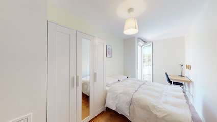 La "Room 4" est spécialement aménagée pour une personne avec tout ce qu'il faut : un grand lit confortable, une armoire pour vos vêtements, un bureau pour travailler et une chaise. Elle a même un petit balcon privé ! Vous partagerez une salle de bain moderne avec d'autres colocataires. C'est un petit cocon de 12m² rien que pour vous.