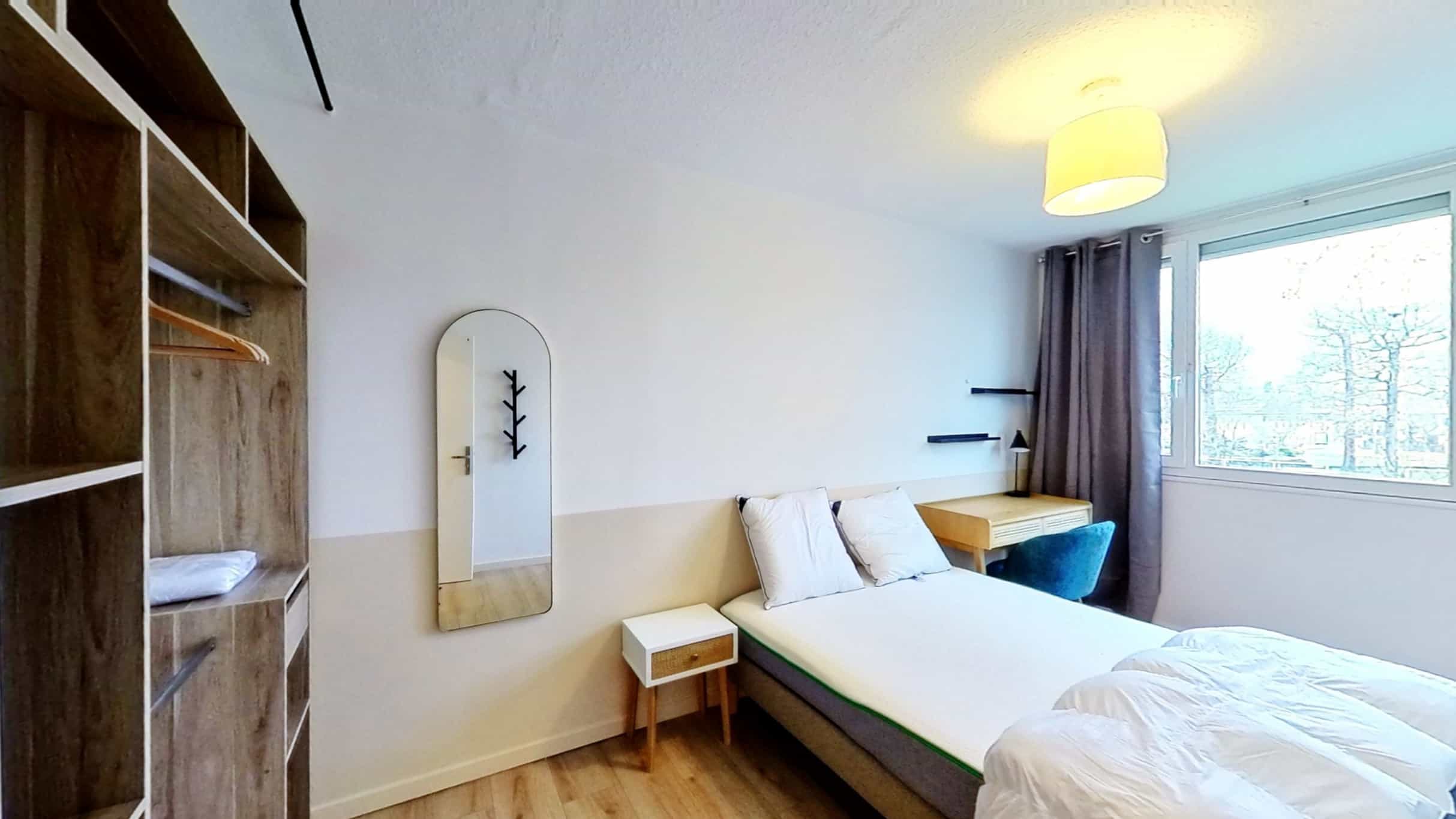 La chambre Room 4, spécialement conçue pour une personne, est un petit cocon de 12 m². Elle dispose d'un confortable lit double avec une literie de qualité, d'une armoire pour ranger vos affaires, d'une chaise et d'un bureau pour étudier ou travailler dans le calme. Vous partagerez une salle de bain bien équipée avec douche, lavabo et toilettes avec d'autres locataires.