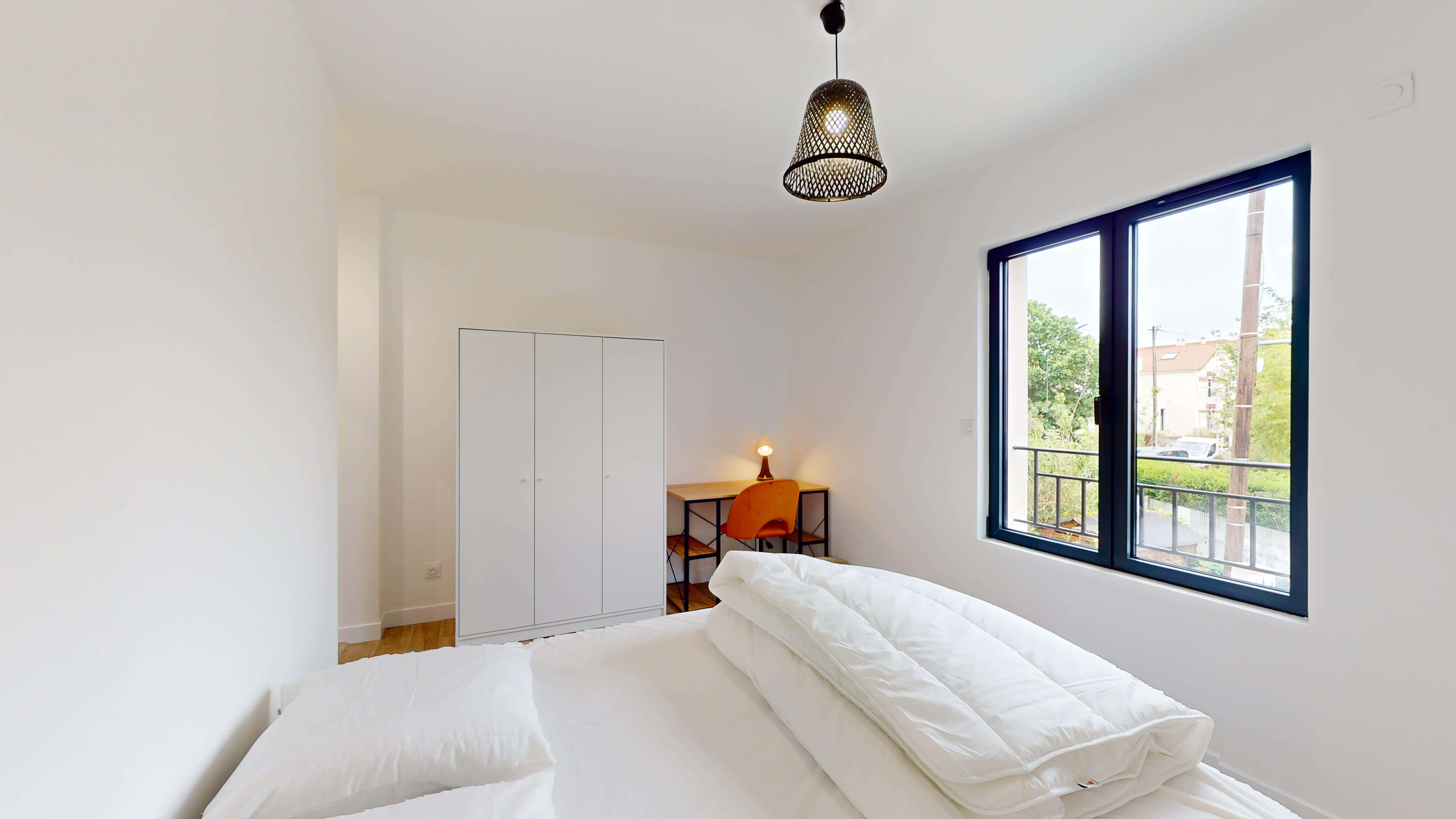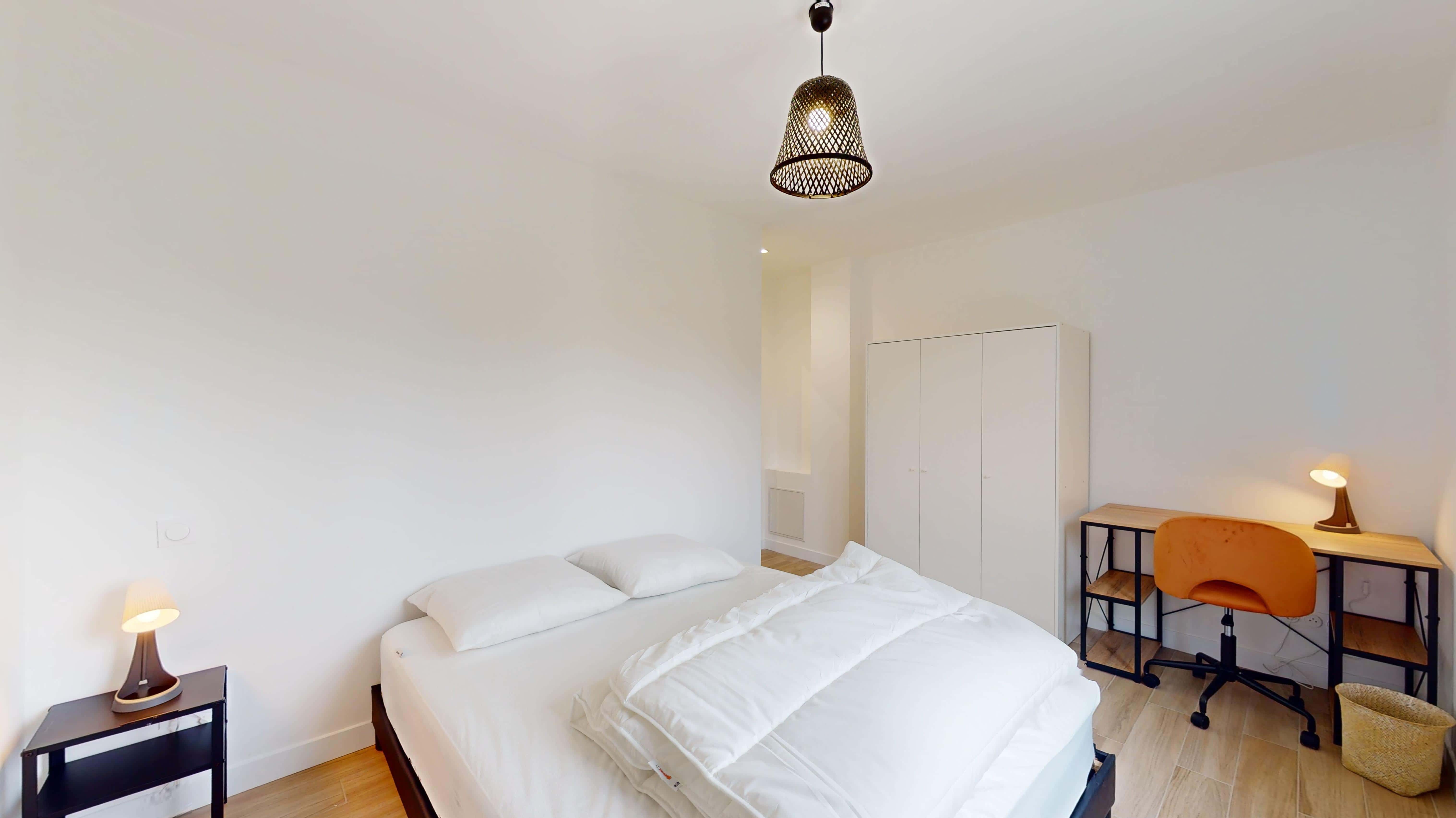 La chambre, conçue pour une personne, est un véritable cocon de confort. Avec son lit double et sa literie de qualité, une armoire spacieuse, un bureau pour travailler et une chaise, vous aurez tout l'espace nécessaire pour vous sentir chez vous. La chambre dispose également d'une salle de bain partagée équipée d'une douche moderne.