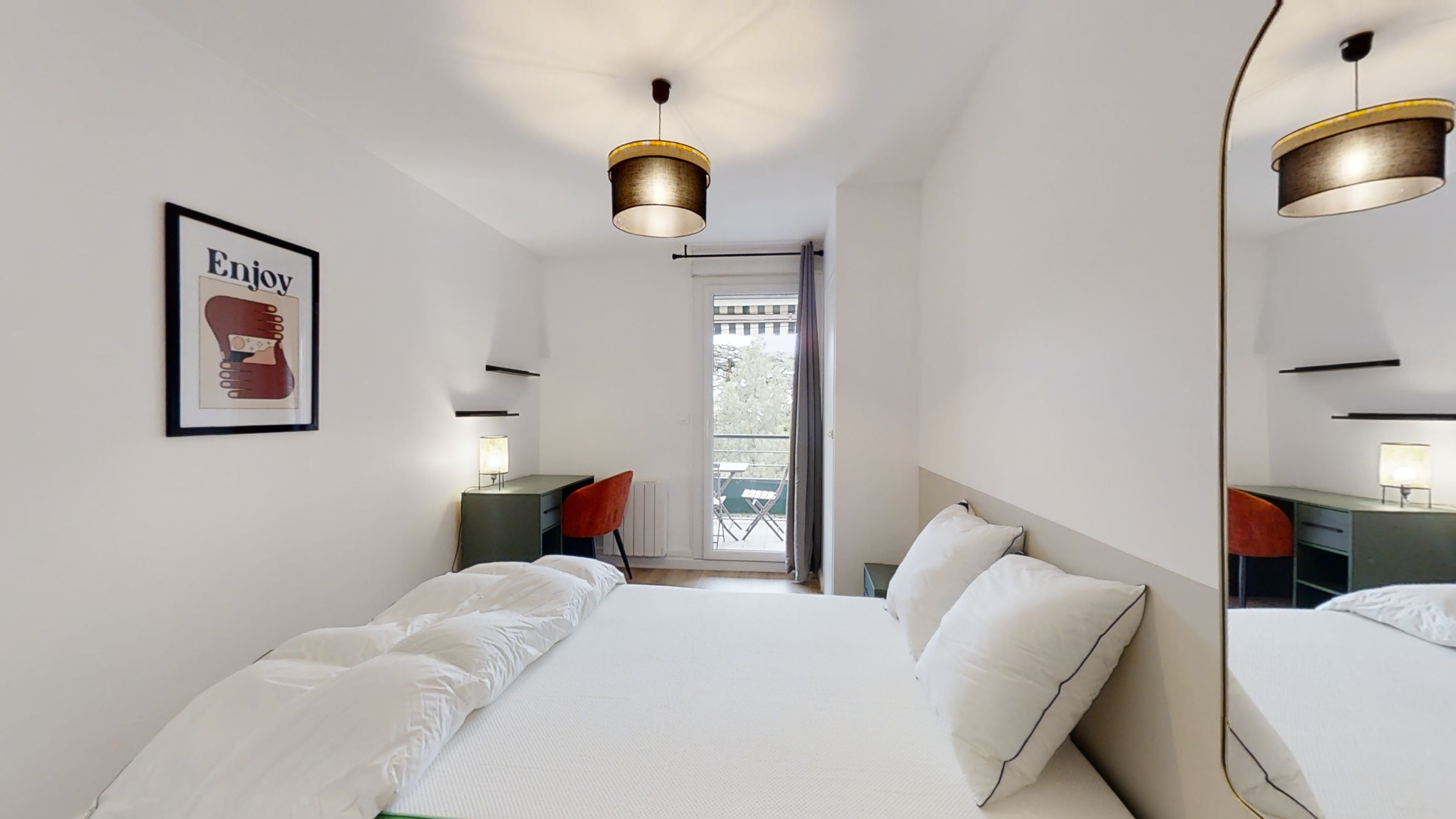 La chambre Room 5, d'une superficie de 11 m², est un espace privé pensé pour une personne. Avec un lit double confortable, une armoire spacieuse, un bureau pratique pour travailler, et une chaise, c'est l'endroit idéal pour se reposer et étudier. La chambre bénéficie également d'un balcon privé, ce qui ajoute à son charme. Elle partage une salle de bain moderne et propre avec les autres locataires.
