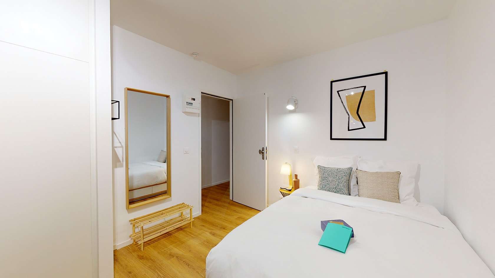 La Chambre 6, située au premier étage, est un cocon parfait pour une personne. Elle est meublée d’un lit double confortable avec rangement intégré, d’une penderie pour vos vêtements, ainsi que d'une table et d'une chaise pour travailler ou étudier en toute tranquillité. La chambre partage une salle de bain bien équipée avec un autre locataire.