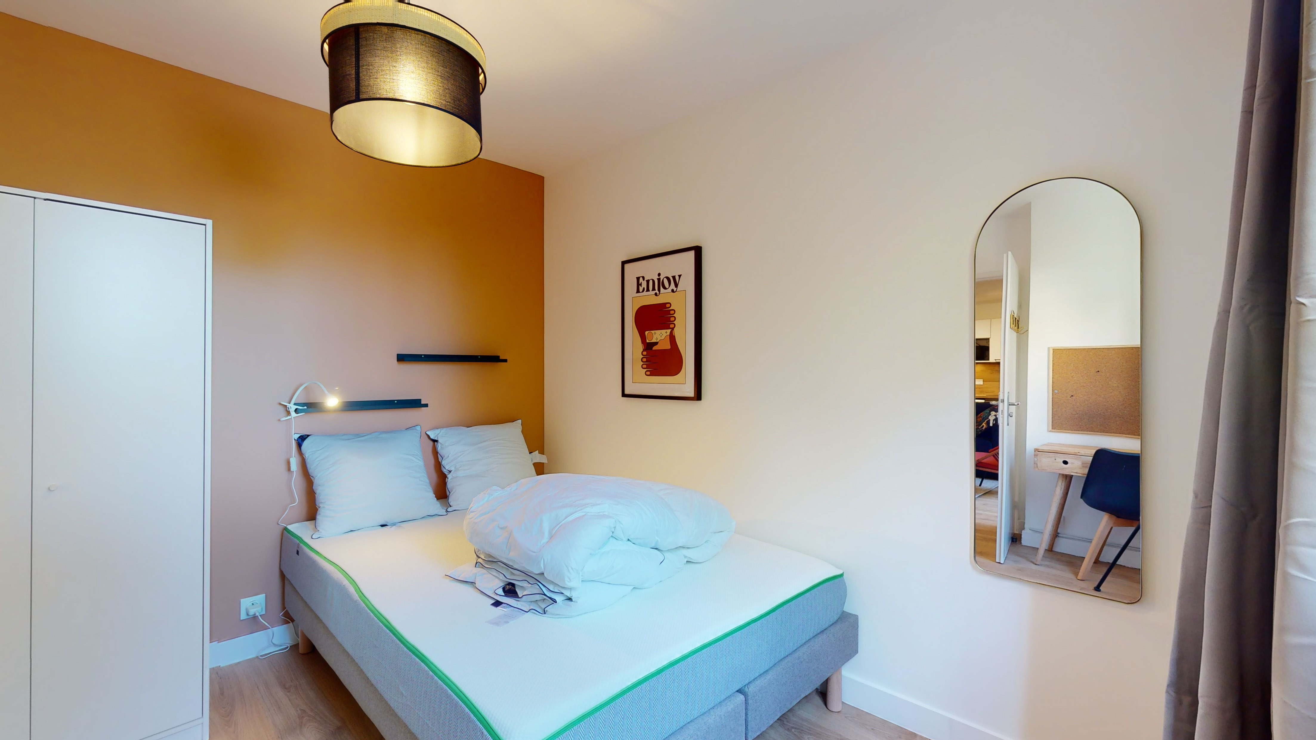 La chambre Room 4 est parfaite pour se reposer ou étudier. Elle est aménagée pour une personne avec un lit double confortable, une armoire pour vos vêtements, un bureau et une chaise pour travailler, ainsi que d'autres commodités comme une connexion Internet rapide. La chambre mesure 9 m² et partage une salle de bain avec douche.
