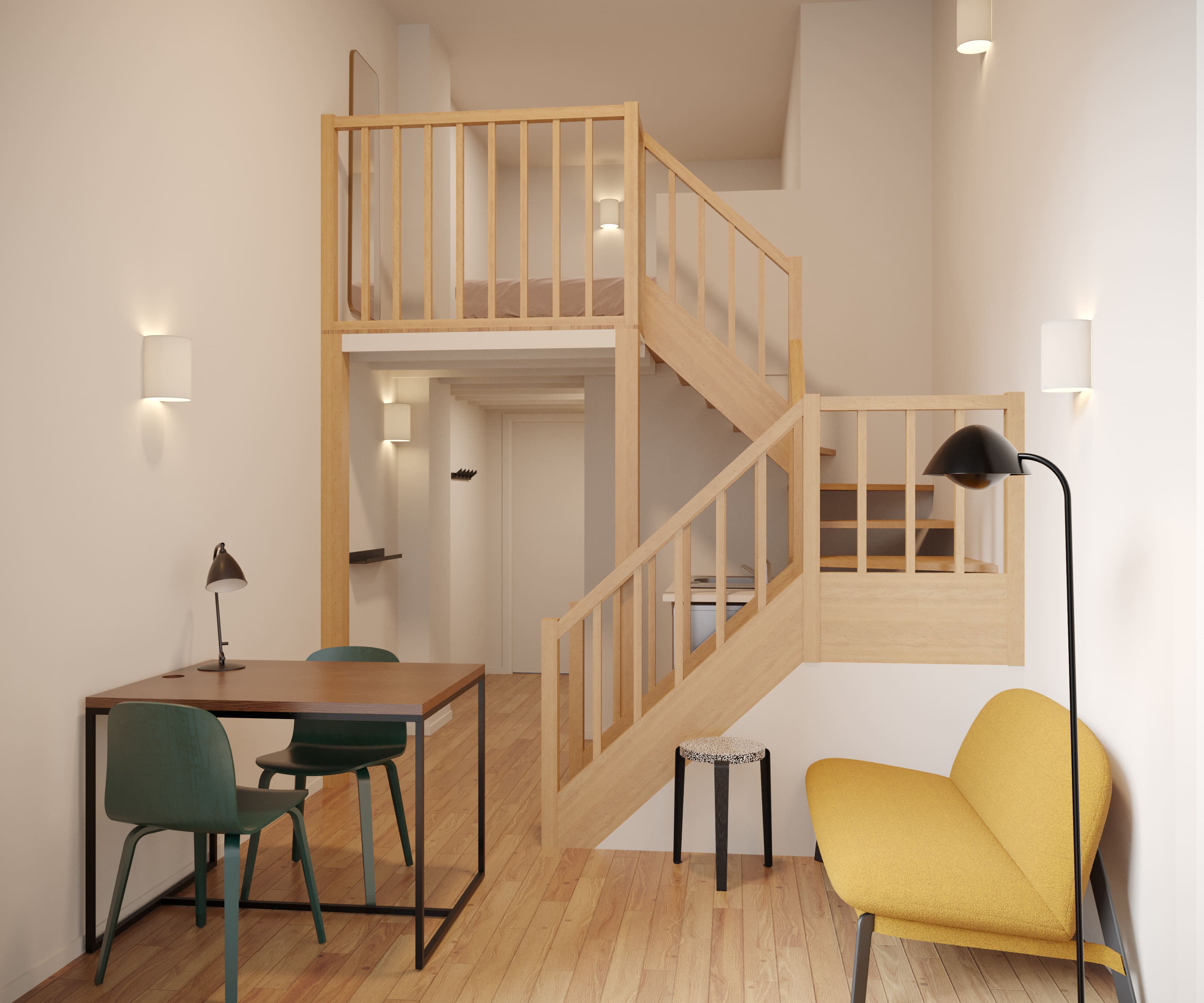 La chambre S2 - 466, située au 4ème étage, est votre espace privé de 11m². Elle est meublée avec un lit double confortable avec rangement intégré, un bureau pour étudier ou travailler, une chaise, une penderie pour vos vêtements, et des étagères murales pour vos objets personnels. La chambre bénéficie également d'une salle de bain partagée avec une autre unité. Vous y trouverez tout le nécessaire : miroir, rideaux ou stores pour votre intimité, et même une literie de qualité supérieure.