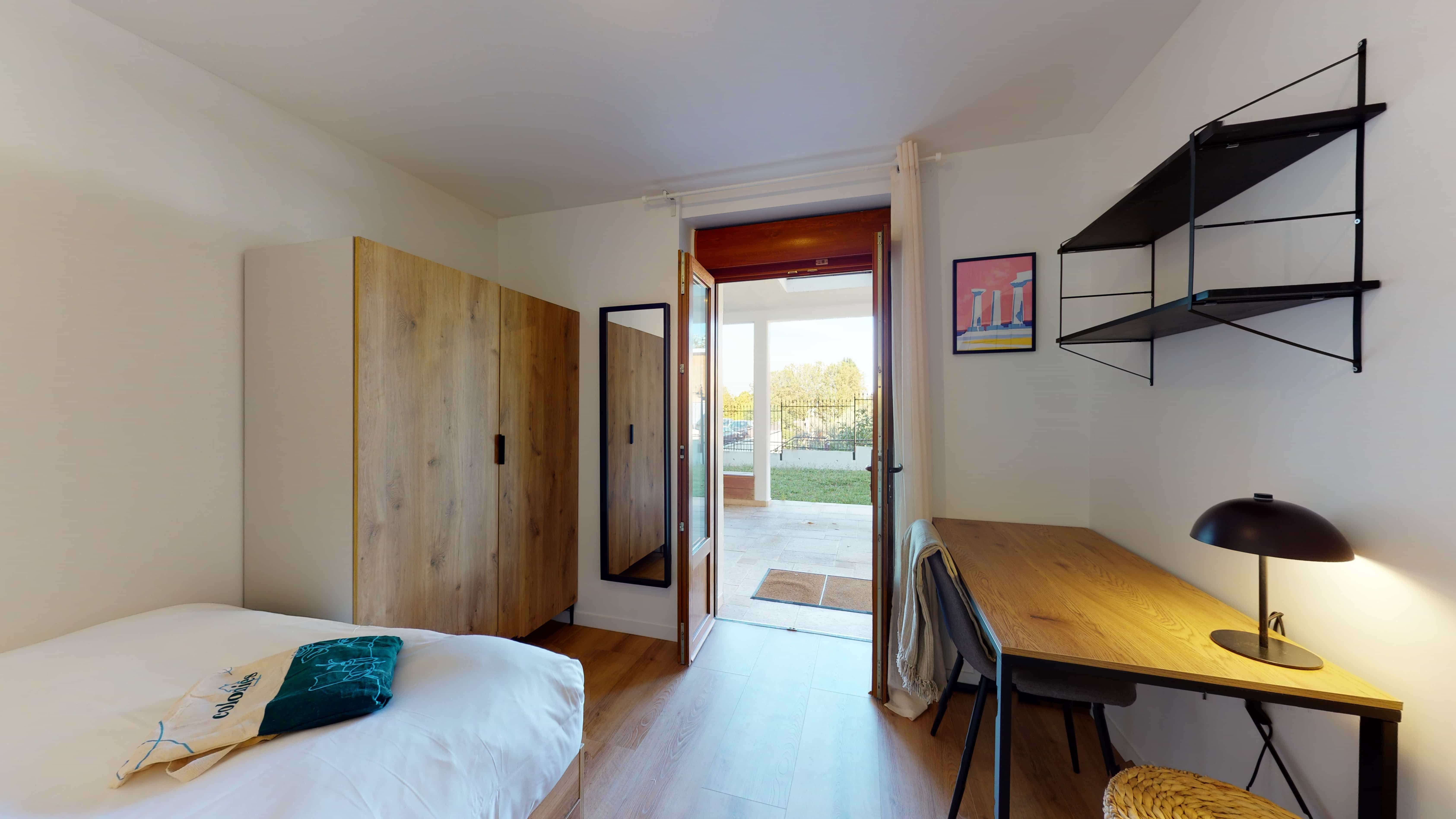 La chambre "Room for one person - 2" est un cocon douillet de 10m² situé au rez-de-jardin. Elle est parfaite pour une personne avec son lit double confortable, une armoire pour vos affaires, un bureau et une chaise pour travailler ou étudier. La chambre partage une salle de bain avec une autre personne et bénéficie d'un accès direct à la terrasse extérieure.