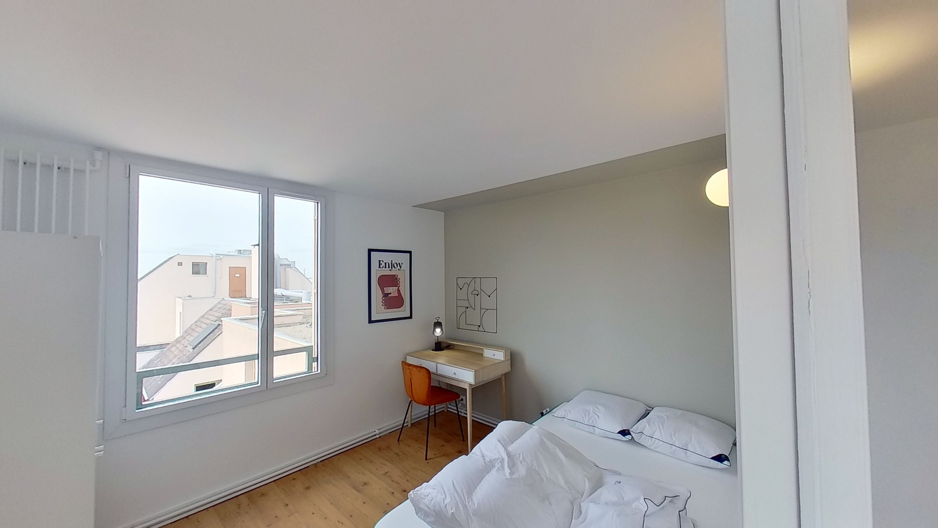 La chambre Room 6 est un espace personnel de 10 m² conçu pour une personne, offrant un lit double confortable avec une literie de qualité, une armoire spacieuse pour vos affaires, ainsi qu'un bureau et une chaise pour travailler ou étudier tranquillement. Elle partage une salle de bain moderne avec d'autres résidents.