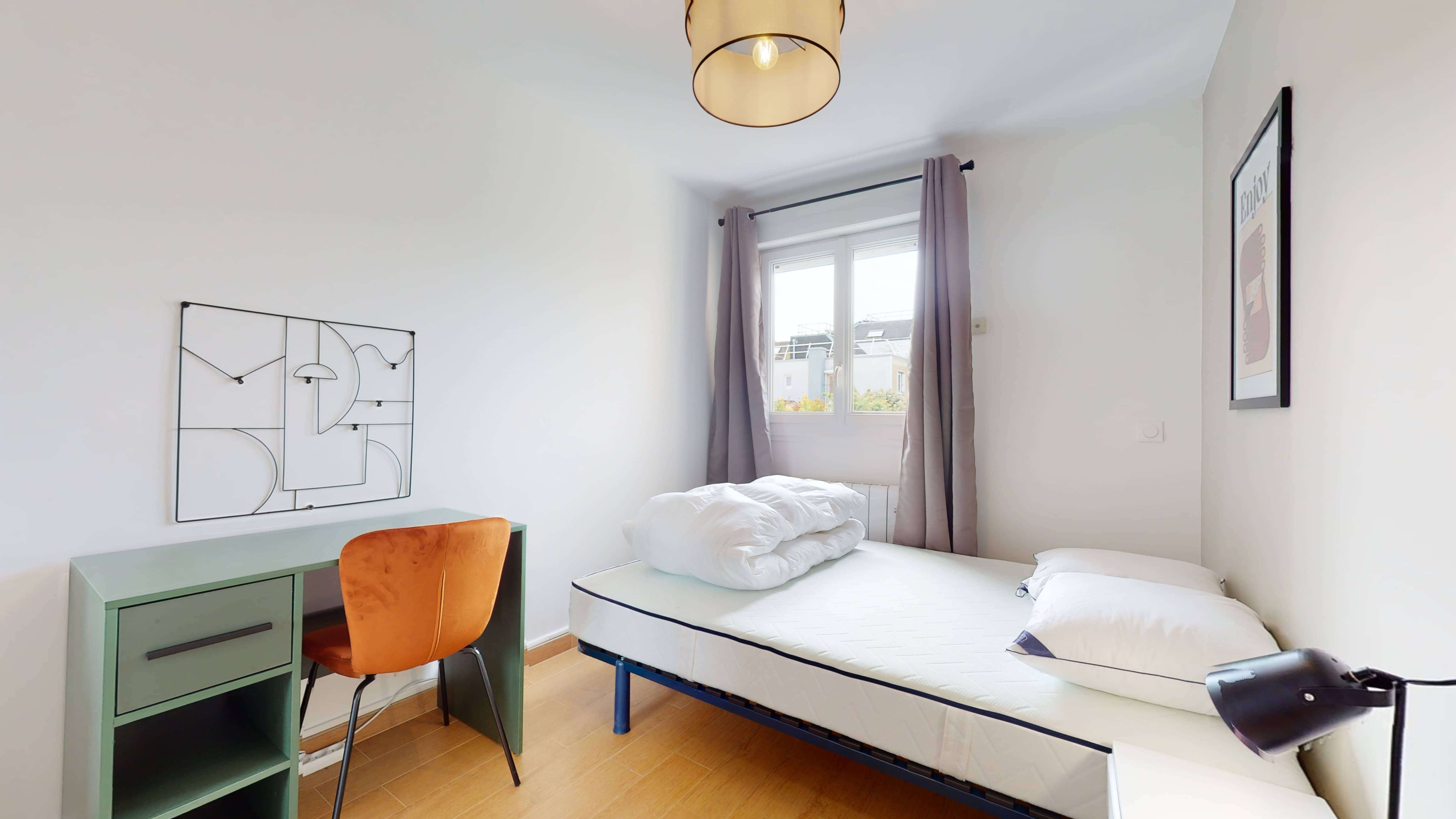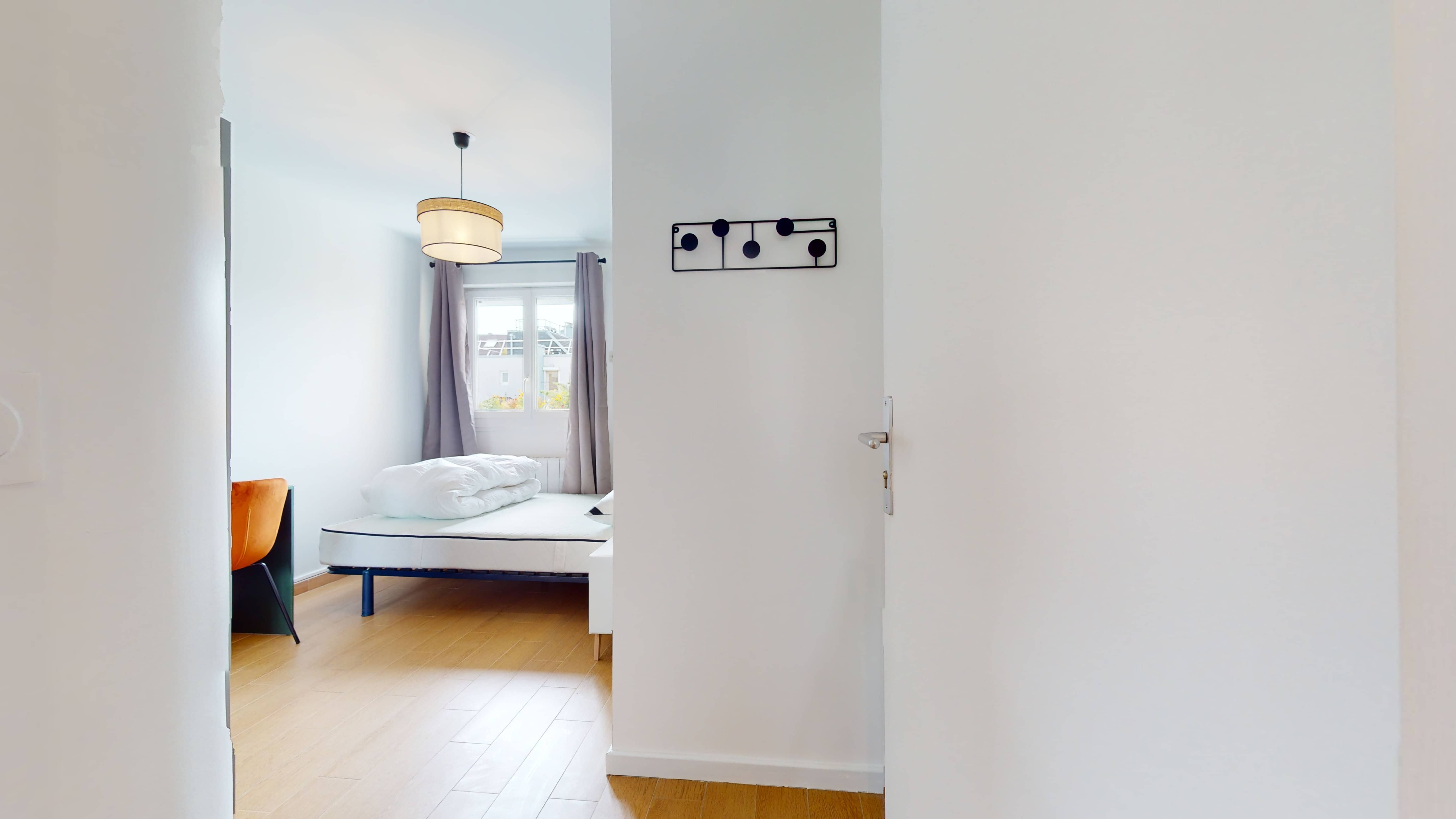 Room 2 est votre espace personnel au sein de la colocation. C'est une chambre conçue pour une personne et elle est bien aménagée avec un lit double confortable, une armoire pour vos affaires, ainsi qu'une chaise et un bureau pour travailler ou étudier. La chambre partage une salle de bain moderne avec d'autres locataires. Vous y trouverez aussi des équipements pratiques comme des étagères murales, une poubelle, un radiateur et un accès internet haut débit.
