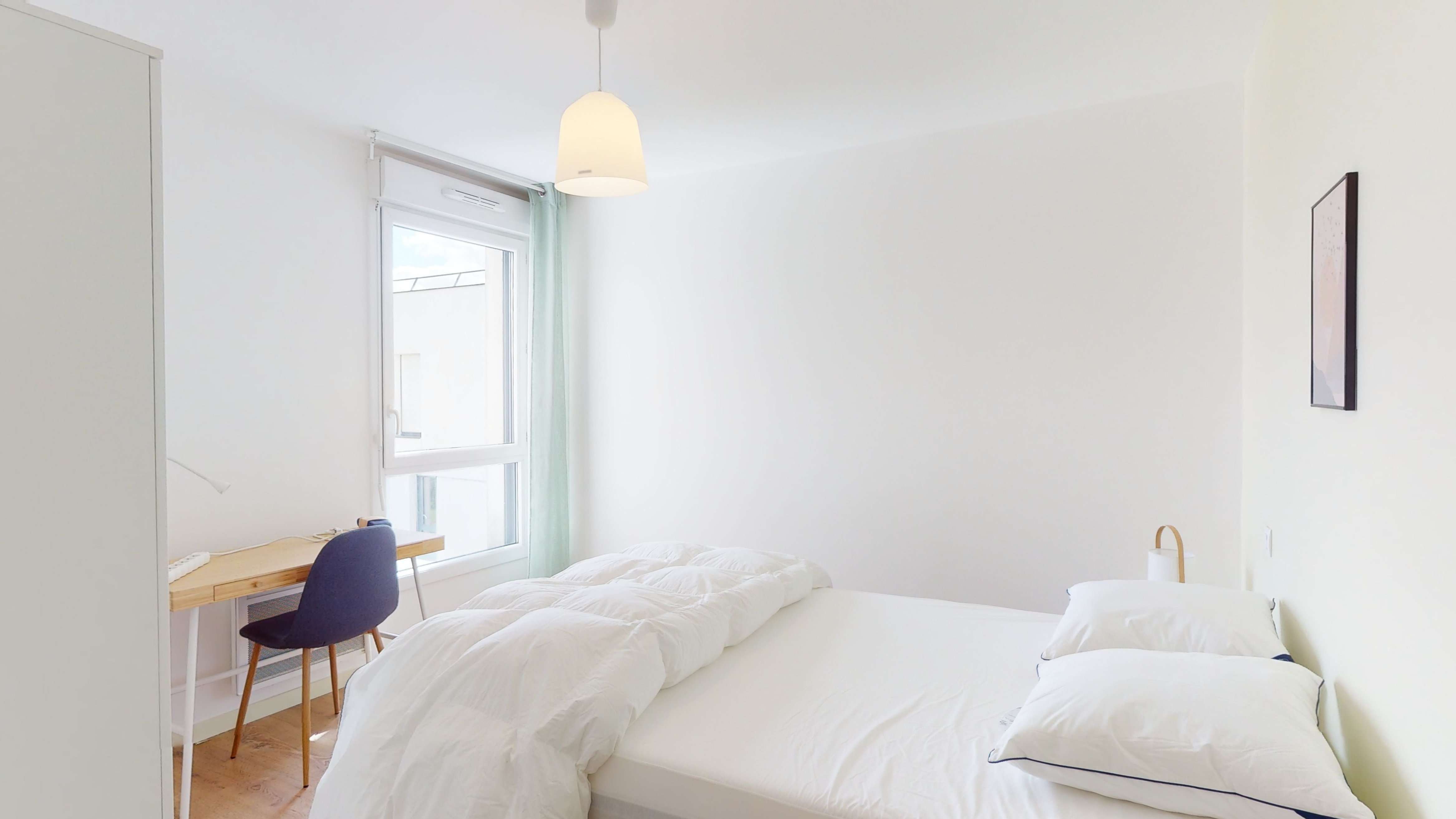 La chambre 1, conçue spécialement pour une personne, est équipée d'un confortable lit double, d'une armoire spacieuse, d'une chaise et d'un bureau pour travailler ou étudier en toute tranquillité. Elle bénéficie d'une lumière naturelle et donne accès à un balcon privé. La chambre partage une salle de bain moderne avec douche et toilettes.
