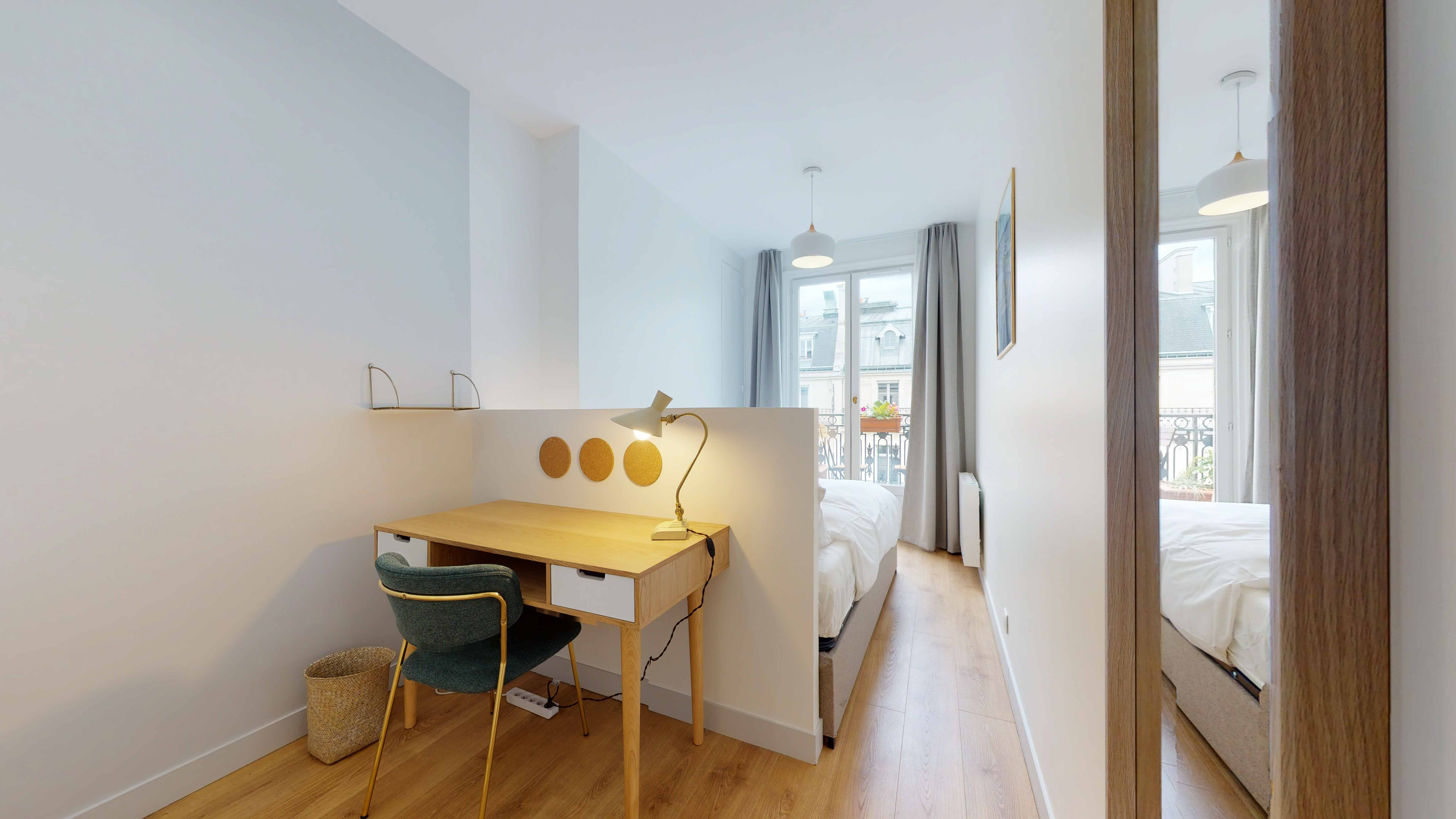La chambre "Room for one person - 4" est située au cinquième étage et offre tout le confort nécessaire pour une personne. Elle est équipée d'un lit double avec une literie de qualité, d'une armoire pour ranger vos affaires, d'un bureau avec une chaise et une lampe de bureau pour travailler ou étudier, ainsi qu'un accès direct à une terrasse. La chambre partage une salle de bain moderne avec douche, lavabo et toilettes avec un autre locataire.