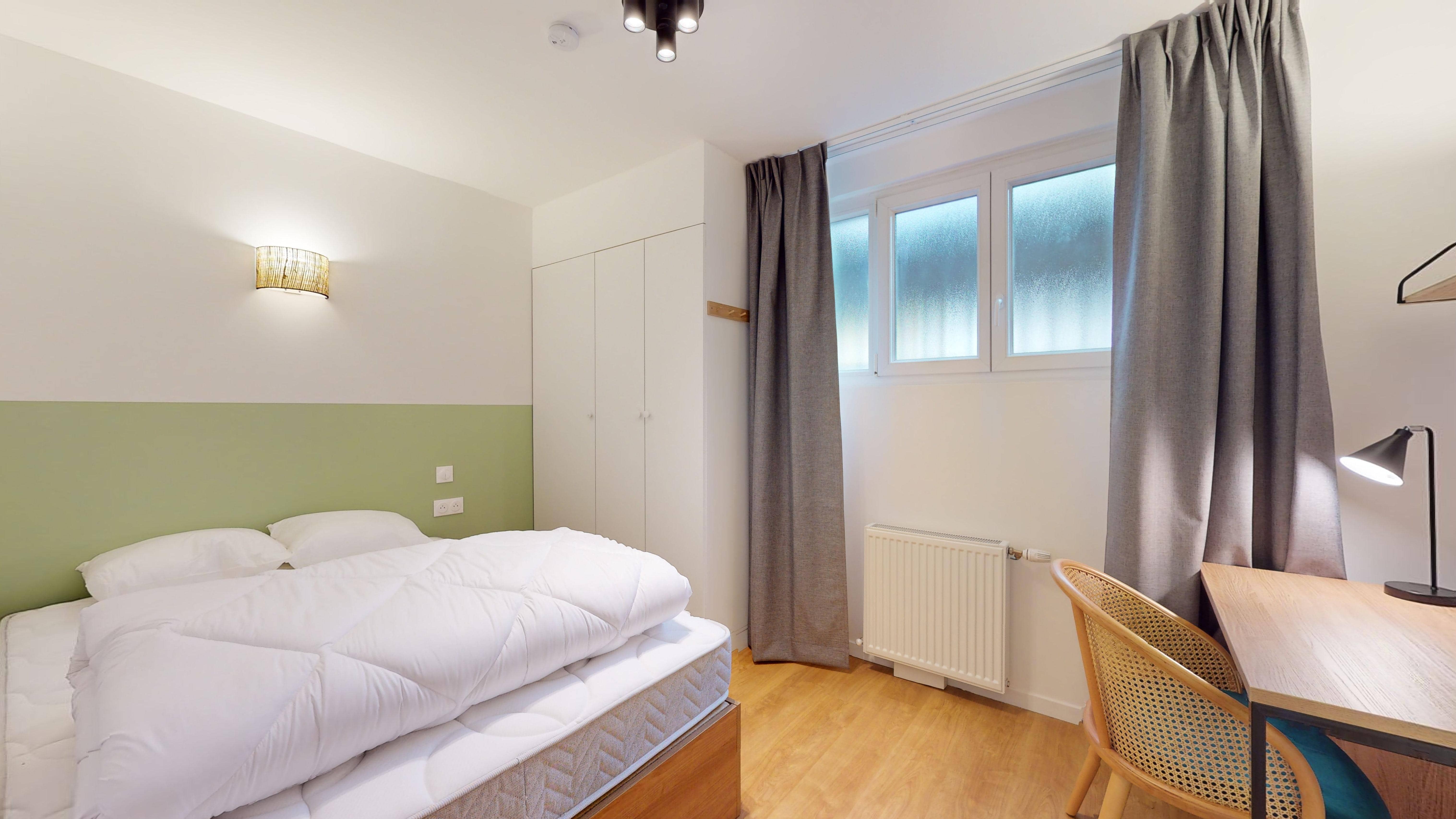 La chambre "Room for one person - 8", située au premier étage, est un véritable cocon personnel. Elle est meublée d'un confortable lit double avec des draps de qualité, d'une armoire pour vos vêtements, d'un bureau et d'une chaise pour travailler ou étudier. La chambre dispose également d'une salle de bain privée avec douche, offrant intimité et confort.