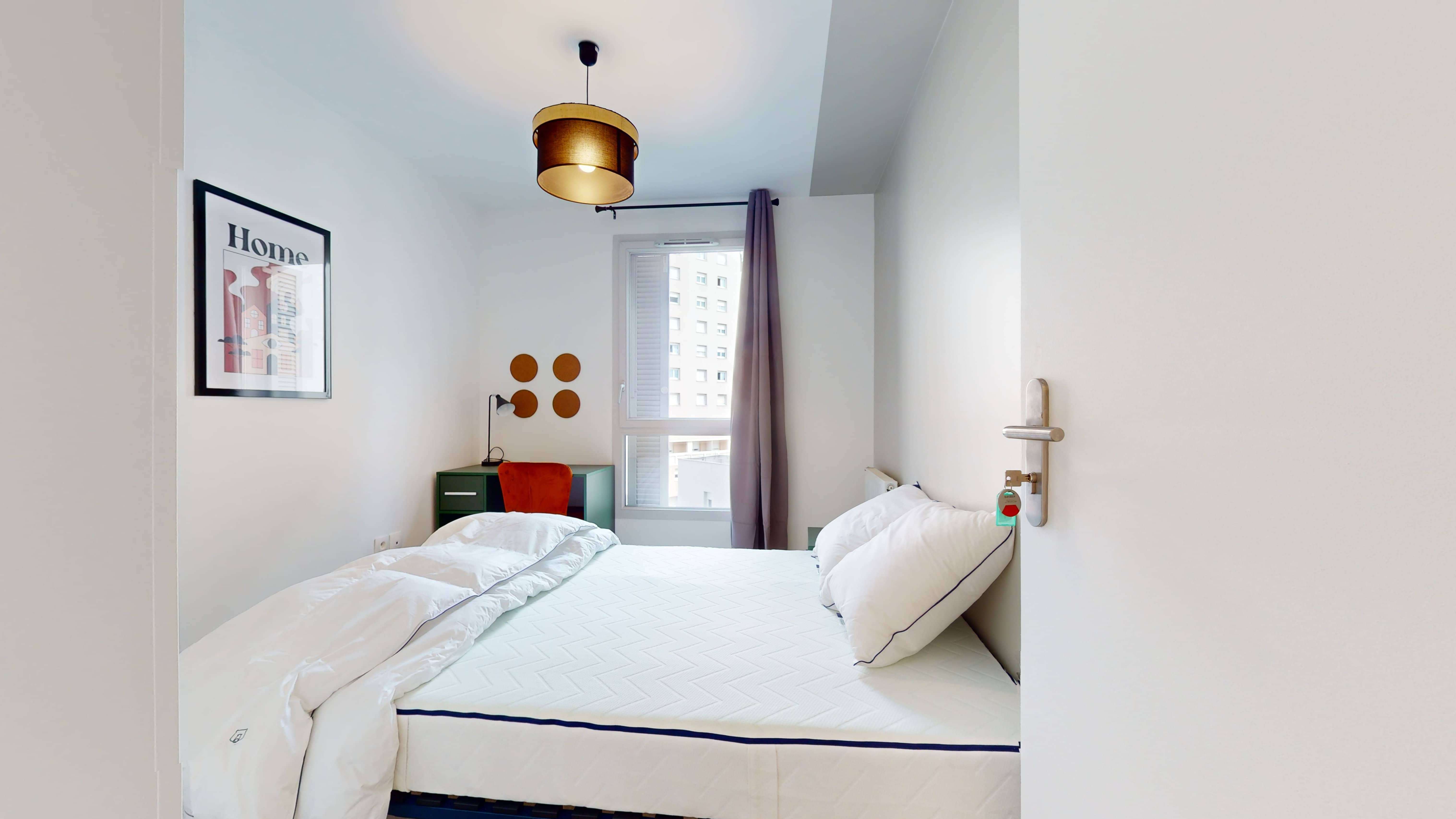 La chambre Room 2, d'une superficie de 10 m², est parfaite pour une personne. Elle dispose d'un lit double confortable, d'une armoire spacieuse pour vos affaires, d'un bureau pour étudier et d'une chaise. Cette pièce chaleureuse partage une salle de bain bien entretenue avec d'autres locataires.