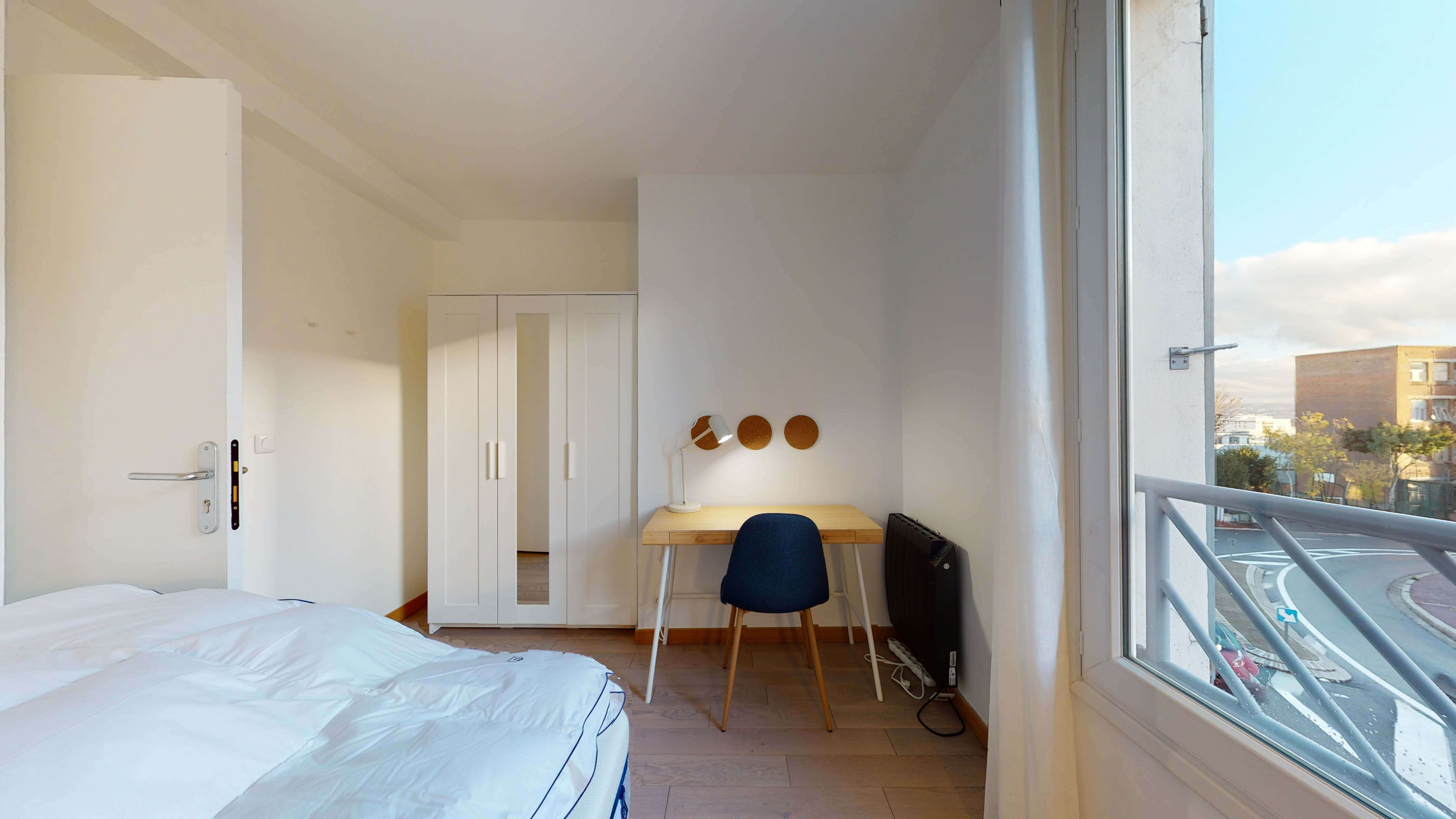 La chambre 3, pensée pour une personne, est cosy et fonctionnelle. Elle dispose d'un lit double confortable avec de la literie de qualité, d'une armoire pour vos vêtements, d'une chaise, d'un bureau pour travailler et d'une table de nuit avec une lampe. Vous partagerez une salle de bain propre et équipée d'une douche, d'un lavabo et de toilettes avec quelques autres locataires.