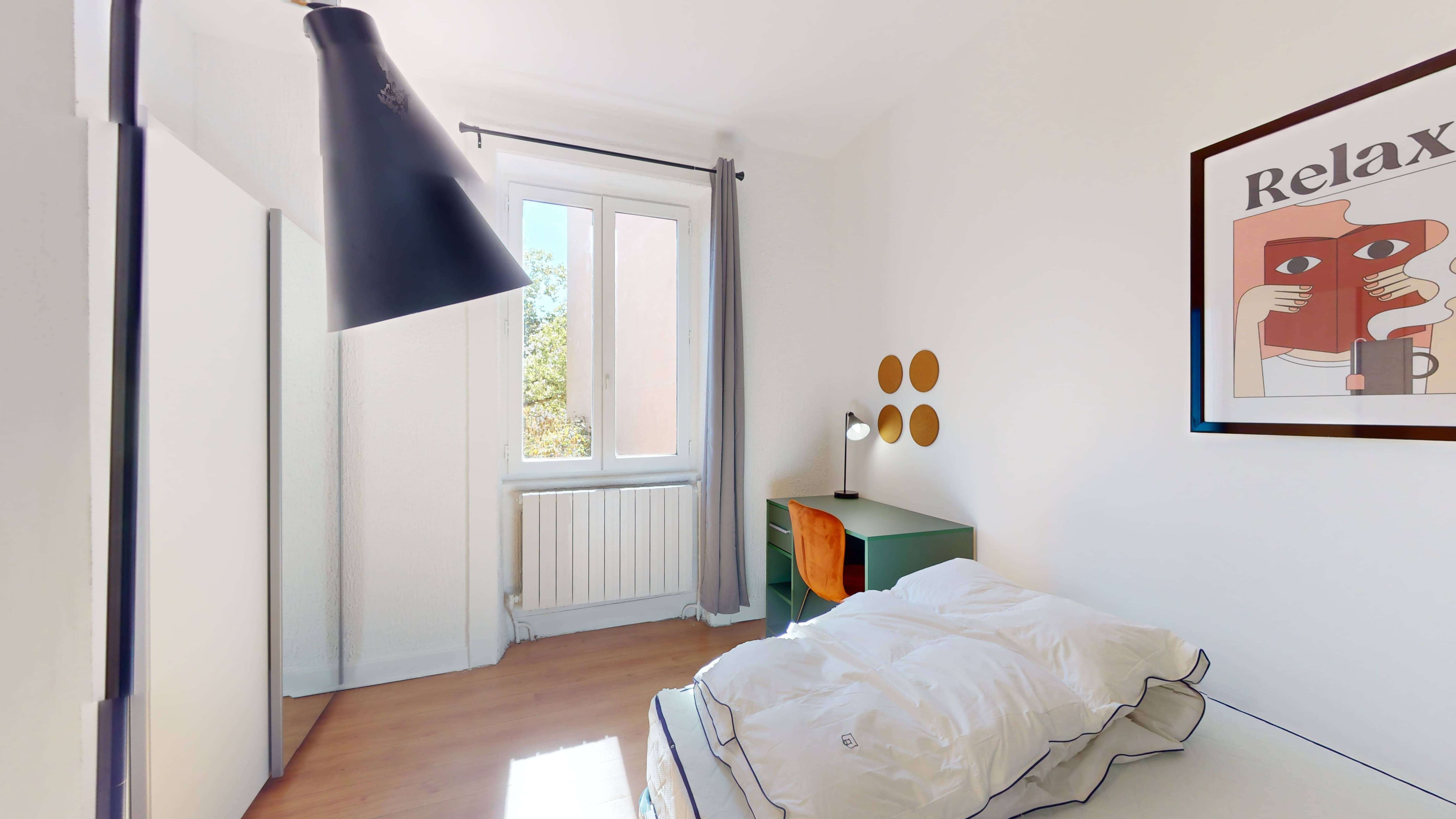 La chambre disponible, nommée "Room 2", est parfaite pour une personne. Elle a un grand lit douillet, une armoire pour ranger toutes tes affaires, et un bureau pour travailler ou étudier tranquillement. La chambre partage une jolie salle de bain avec d'autres locataires.