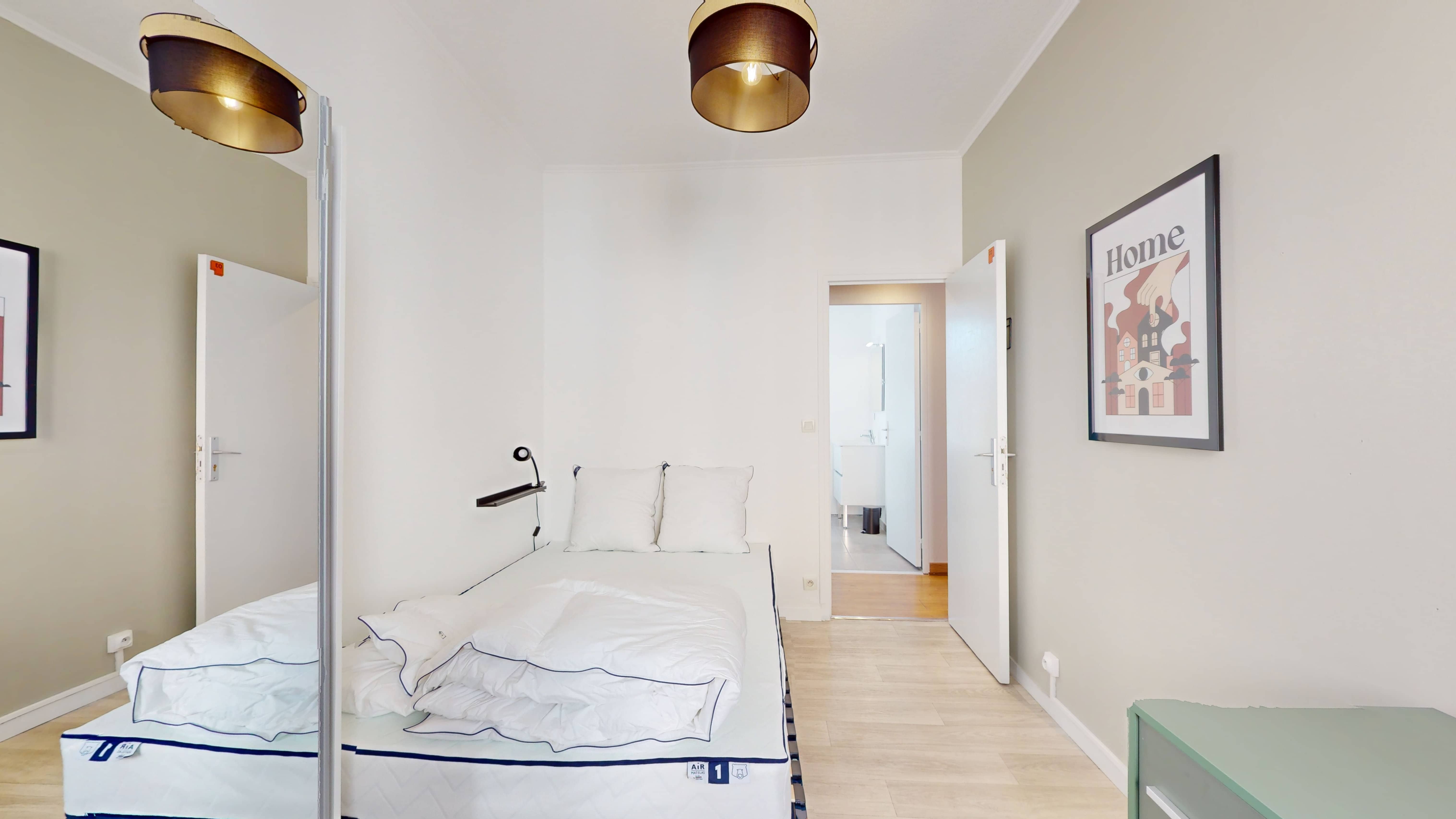 La chambre 3 est conçue juste pour vous, avec un confortable lit double, une armoire spacieuse et un espace de travail composé d'un bureau et d'une chaise. Vous partagerez une salle de bain moderne avec quelques autres colocataires, mais pas de souci, il y a assez d'espace pour que tout le monde se prépare sans stress.