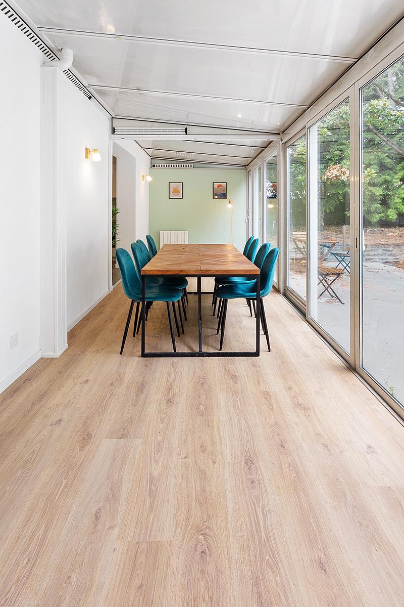 • Salle à manger avec grande table et chaises donnant sur le jardin