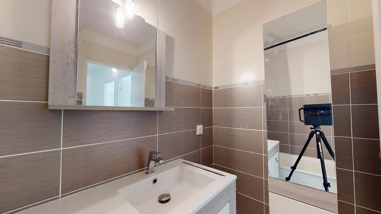 Une première salle de bain dispose d’un meuble vasque et d’une douche, et une seconde salle de bain se munie d’un meuble vasque, d’une baignoire, ainsi que d’un meuble de rangement.