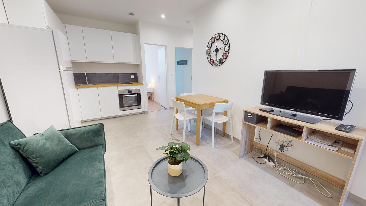 Les parties communes de cette colocation comportent un canapé, une table basse, une TV et une table à manger ainsi qu’une cuisine ouverte.