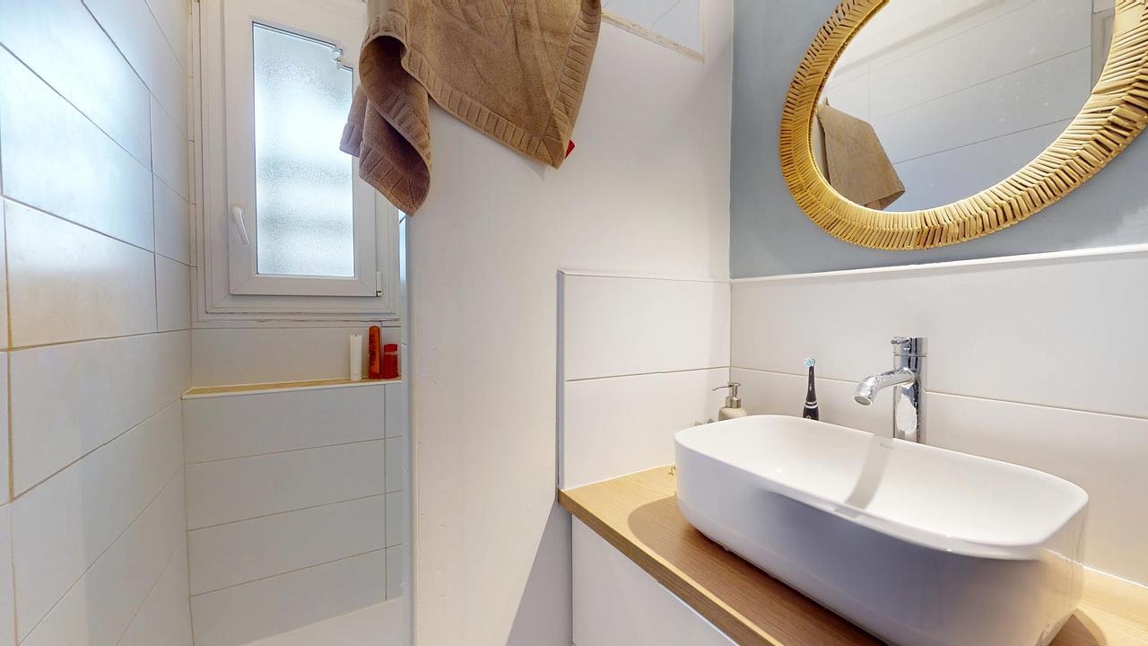 Enfin, la salle d'eau comprend une douche, un meuble vasque avec miroir et des rangements, tandis que les WC sont séparés pour plus de confort.