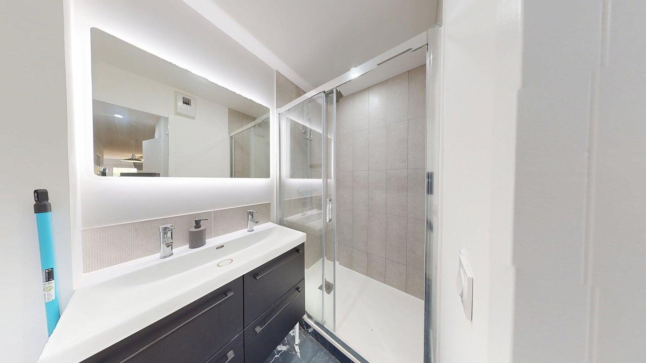 L'appartement accueille deux salles d'eau avec chacune une douche ainsi qu'un meuble vasque avec un miroir. Les toilettes et la machine à laver sont séparées.