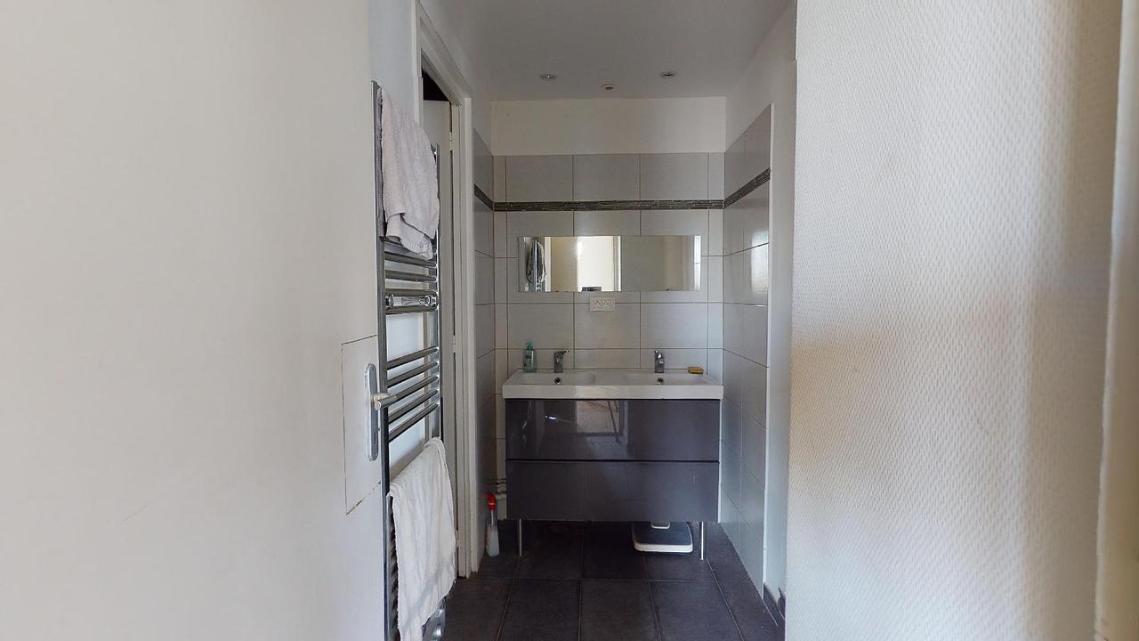 La salle de bain commune est équipée d’une douche, d’un meuble vasque ainsi que d’un sèche serviette.