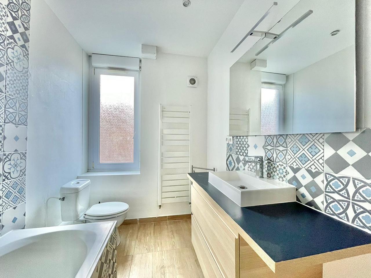 Côté sanitaires, le premier étage dispose d’une salle de bain équipée d’une baignoire, d’un meuble vasque avec miroir, d’un sèche-serviettes et de rangements. Le dernier étage comprend une salle d’eau avec douche, WC intégré et meuble vasque.
