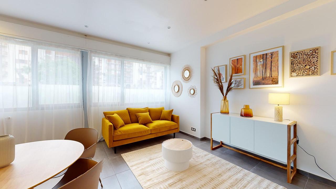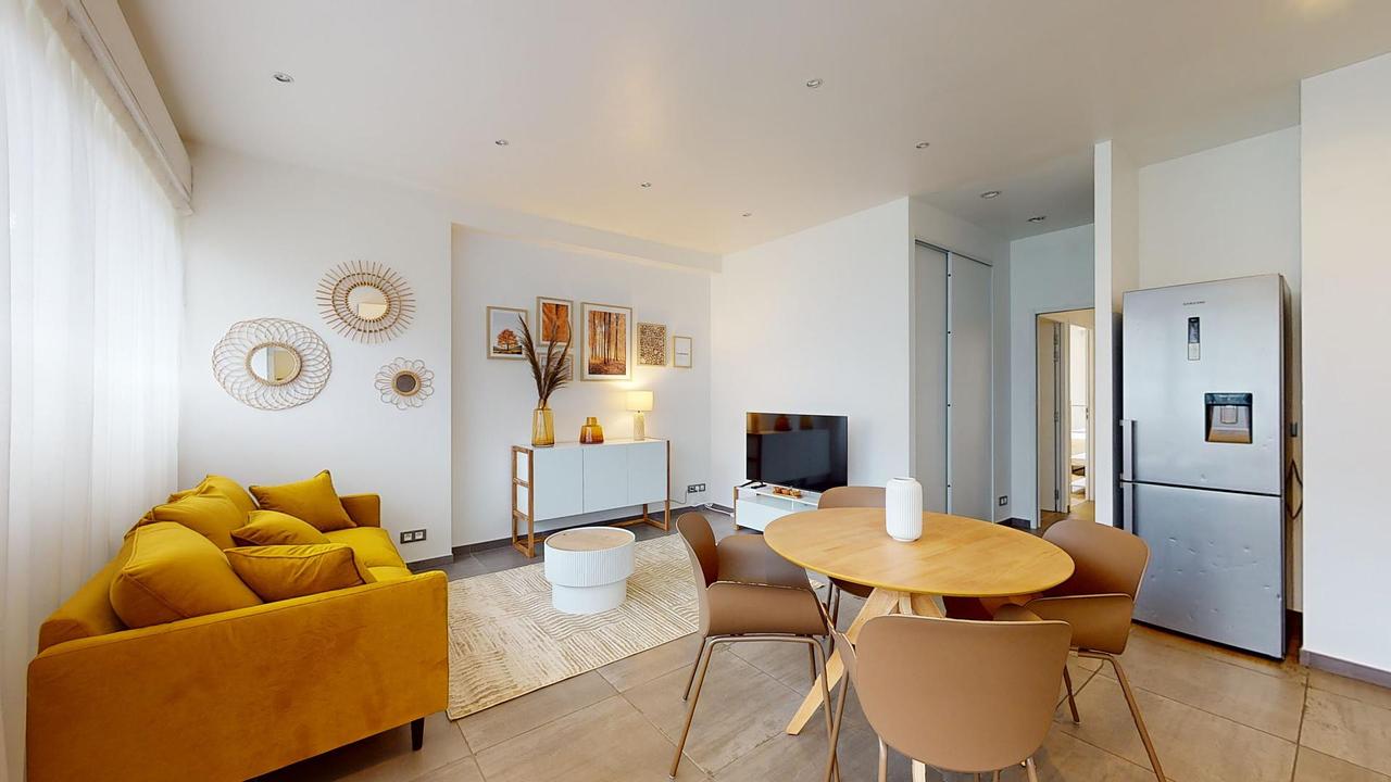 Cet appartement de 4 pièces offre un salon équipé d'un canapé ainsi que d'une télévision et d'un buffet. Le salon est ouvert sur la cuisine qui est aménagée d'un réfrigérateur, d'un lave-vaisselle, d'un évier, d'une machine à café, d'un micro-ondes, d'une plaque de cuissons ainsi que d'une hotte. Une grande fenêtre illumine ces espaces.