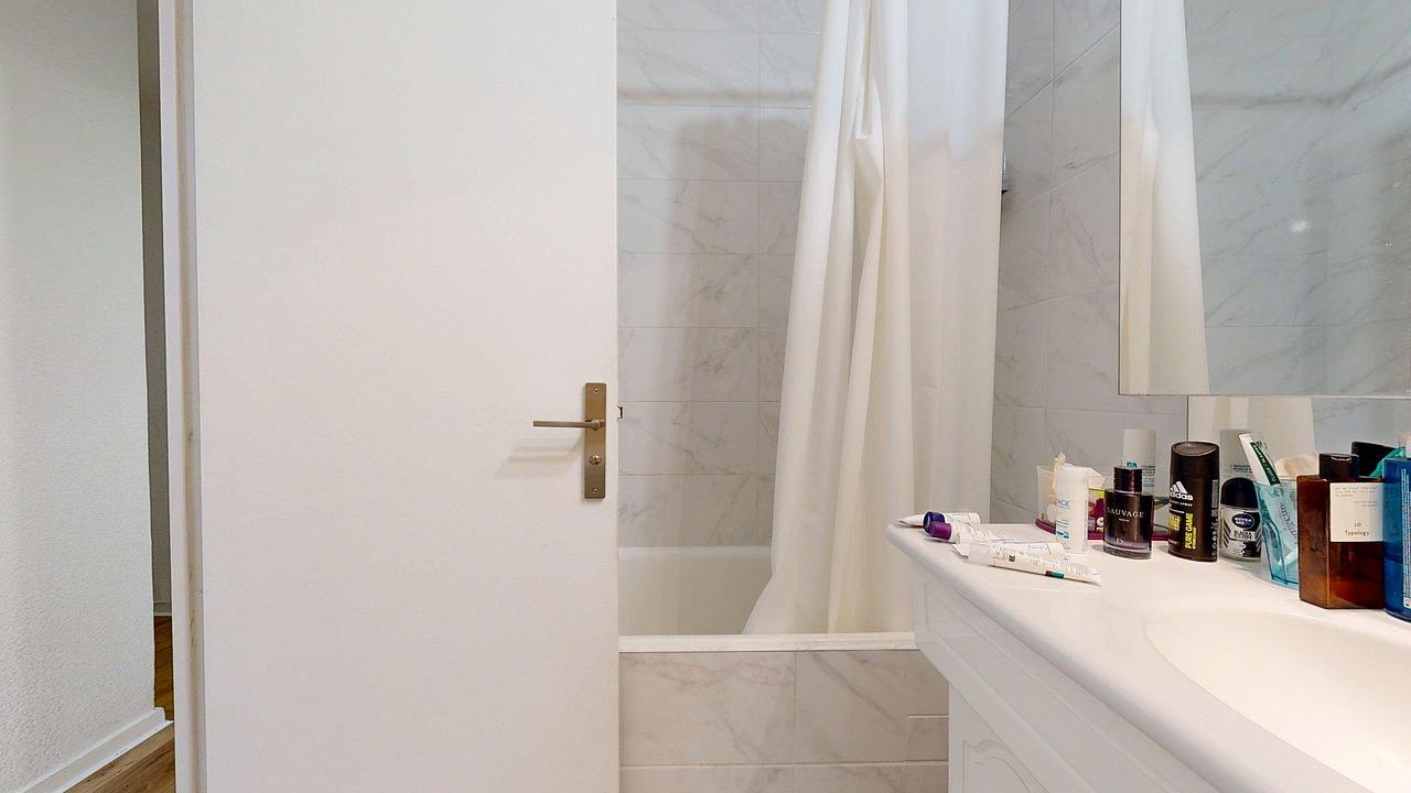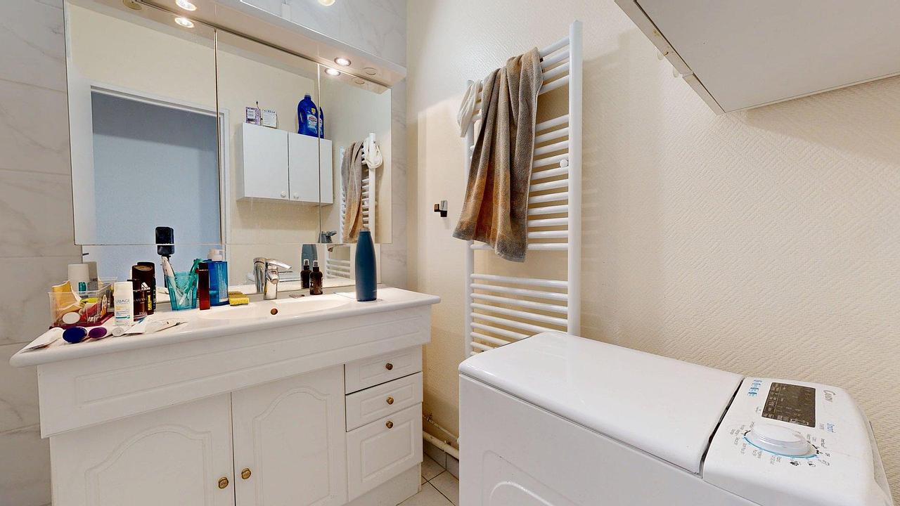 L’appartement comprend également une salle d’eau avec douche à l’italienne, équipée d’un meuble vasque avec point d’eau, d’un miroir et d’un sèche-serviettes, ainsi qu’une salle de bain avec baignoire, meuble vasque, sèche-serviettes, meuble pharmacie et machine à laver.