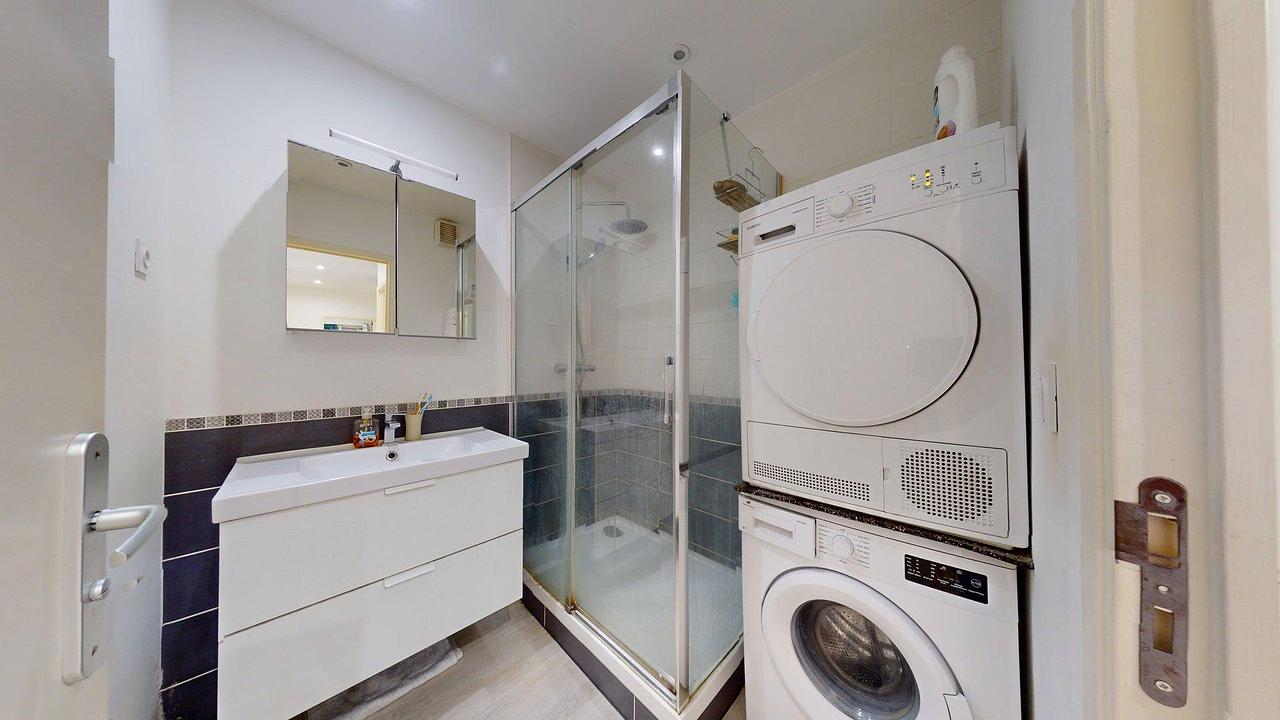 La salle d’eau comprend une douche, un meuble vasque avec miroir, une machine à laver, un sèche-linge et des espaces de rangement. Les WC sont séparés.