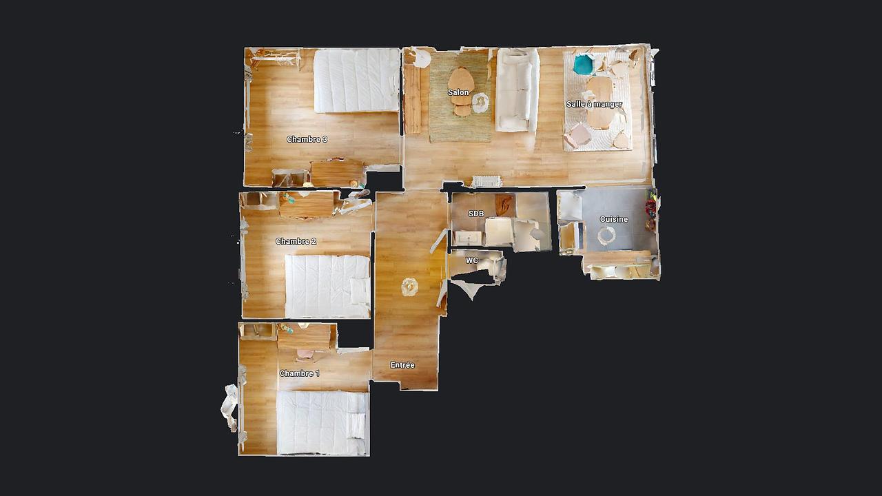 Cet appartement a été entièrement refait à neuf et se compose d’une cuisine ouverte sur une grande pièce de vie, d’une salle de bain, d’un WC indépendant ainsi que de trois chambres similairement agencées avec lit, rangements et bureau.
